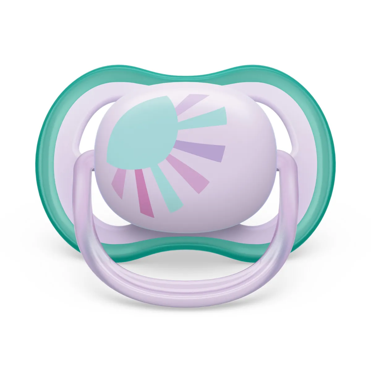 Calma il tuo bambino con il comfort dell’aria. Il ciuccio ultra air Philips Avent è dotato di fori extra-large per mantenere asciutta la pelle del tuo bambino.