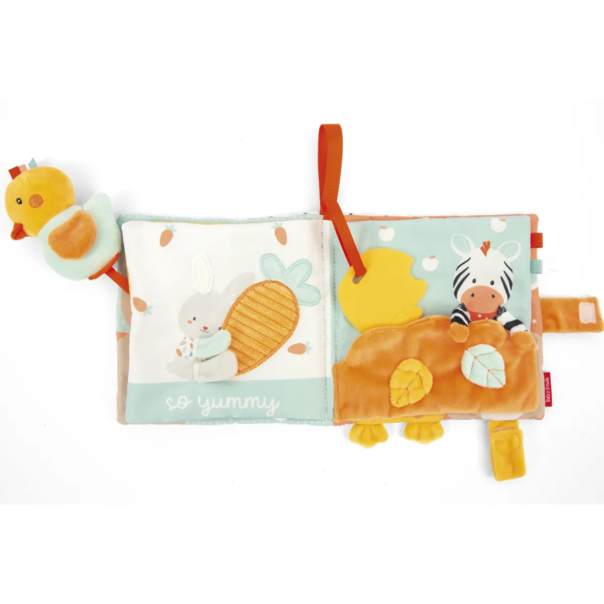 Libretto in tessuto morbido con le immagini dei 4 simpatici amici: la paperella Ducky, Benny l’orsetto, Renè il coniglio e la zebra Zaki! Realizzato con texture sensoriali per sviluppare il senso del tatto ed elementi gioco tridimensioni.