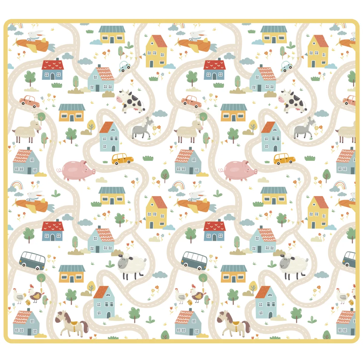 Il design nordico si adatta con stile a ogni ambiente: da un lato un simpatico percorso che si snoda tra casette, alberelli e simpatici animaletti e dall’altro lato nuvolette, arcobaleni, numeri e lettere. I materiali morbidi e sicuri lo rendono perfetto già dai 10 mesi.