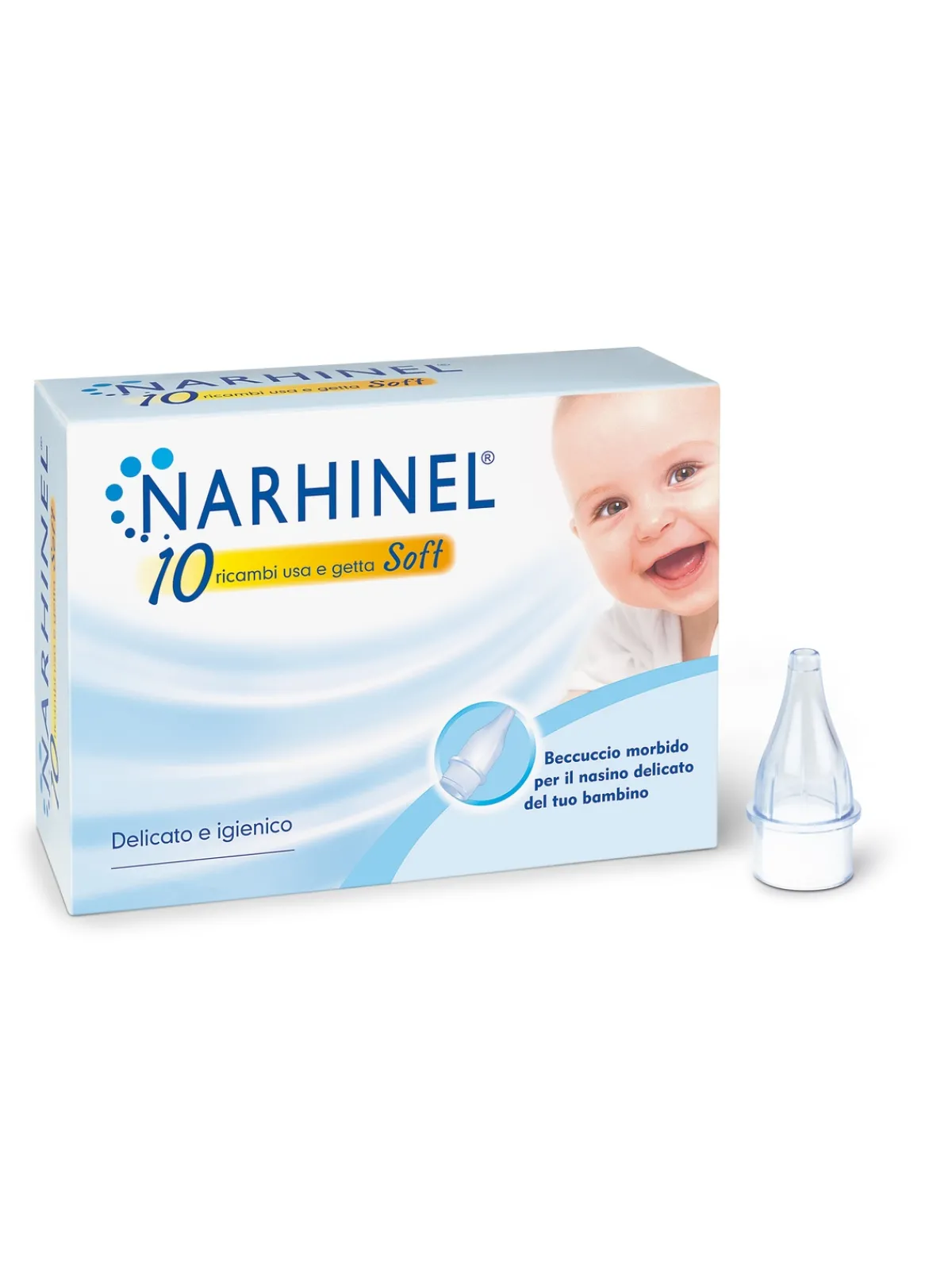 NARHINEL RICAMBI SOFT PER ASPIRATORE NASALE SOFT PER NEONATI E BAMBINI, CONFEZIONE DA 10 PEZZI MONOUSO, sono indicati per l’utilizzo combinato con NARHINEL ASPIRATORE NASALE. SOFT, per liberare il nasino del bambino rimuovendo delicatamente le secrezioni nasali, quando ancora non è in grado di soffiarsi il naso da solo. Sono in plastica morbida e si adattano al nasino. Ogni ricambio, confezionato singolarmente, include un filtro assorbente che trattiene il muco ed offre un’elevata igiene durante l’aspiratorazione.NARHINEL RICAMBI se usati in combinazione con NARHINEL ASPIRATORE NASALE liberano il nasino e aiutano il tuo bambino a respirare, mangiare, dormire normalmente e sentirsi di nuovo meglio.L’eliminazione delle secrezioni nasali aiuta a prevenire ulteriori complicazioni come otite e sinusite. Migliora anche la qualità del sonno del tuo bambino durante episodi di raffreddore comune.Puoi provare la DOPPIA AZIONE del METODO NARHINEL per aiutare il tuo bambino a respirare meglio:1.NARHINEL SOLUZIONE FISIOLOGICA ammorbidisce il muco ed offre una delicata detersione nasale2.NARHINEL ASPIRATORE NASALE, aiuta a rimuovere il muco. Sono dispositivi medici CE (n. 0459 per la soluzione fisiologica). Leggere attentamente le avvertenze e le istruzioni per l’uso.