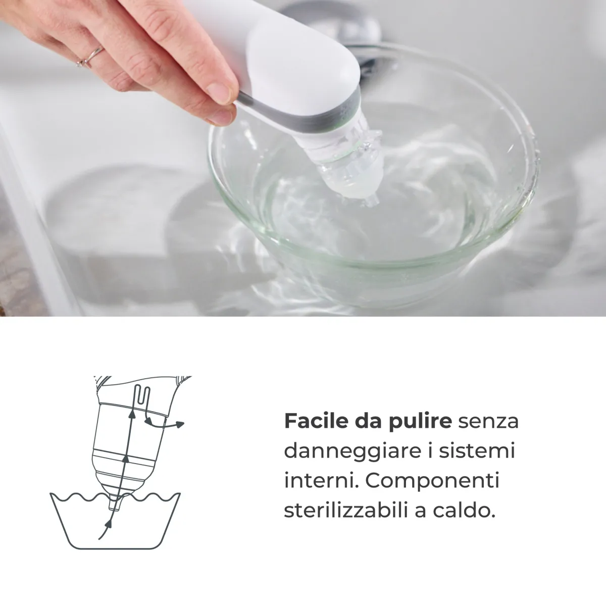I beccucci nasali ed il serbatoio per il muco, oltre a poter essere sciacquati con acqua corrente, sono facilmente sterilizzabili a caldo sia in acqua bollente che con lo sterilizzatore a vapore, garantendo una pulizia completa specialmente in caso di infezioni batteriche e virali o quando i bambini sono molto piccoli.