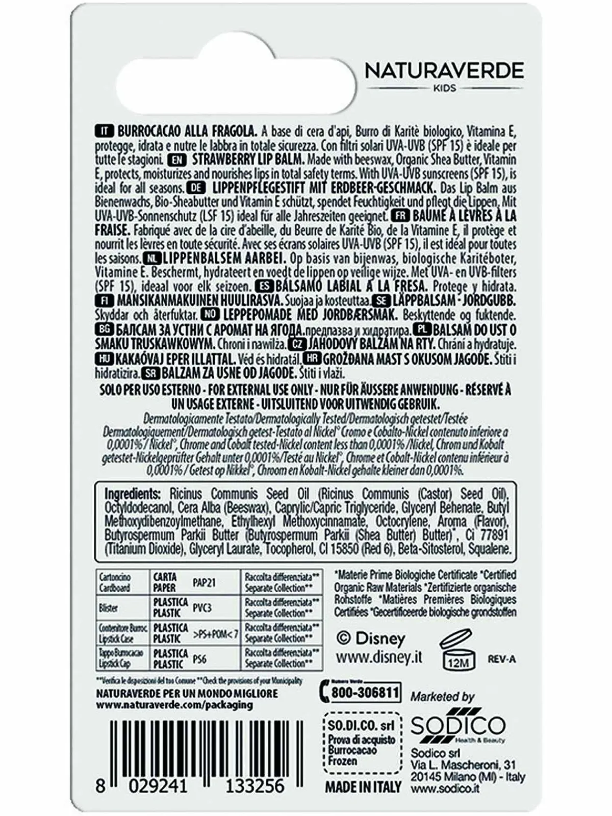 Il Burrocacao alla fragola Disney Frozen, a base di cera d’api, burro di karitè biologico, vitamina E, protegge, idrata e nutre le labbra in totale sicurezza. Con filtri solari UVA-UVB (SPF 15) è ideale per tutte le stagioni