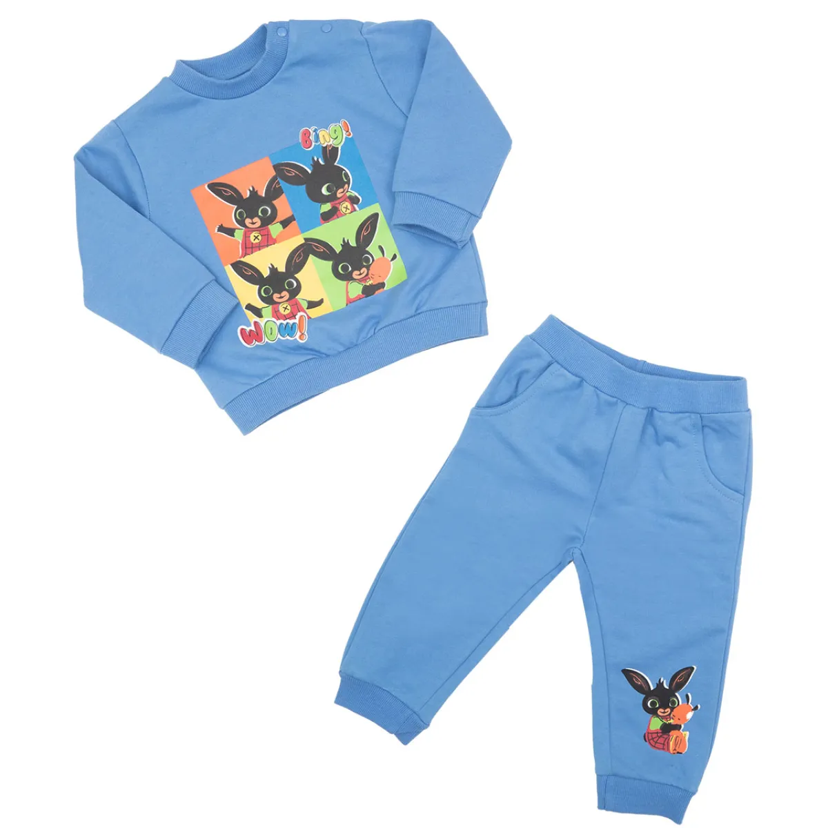 Tuta jogging felpata da bambino a tema “Bing”. Il completo è composto da felpa azzurra con stampa grande e pantalone in tinta con stampe piccole. La vestibilità è morbida e regolabile grazie a elastico in girovita e ai bottoni ad altezza girocollo. Accessori non in vendita. La confezione contiene solo il capo d’abbigliamento