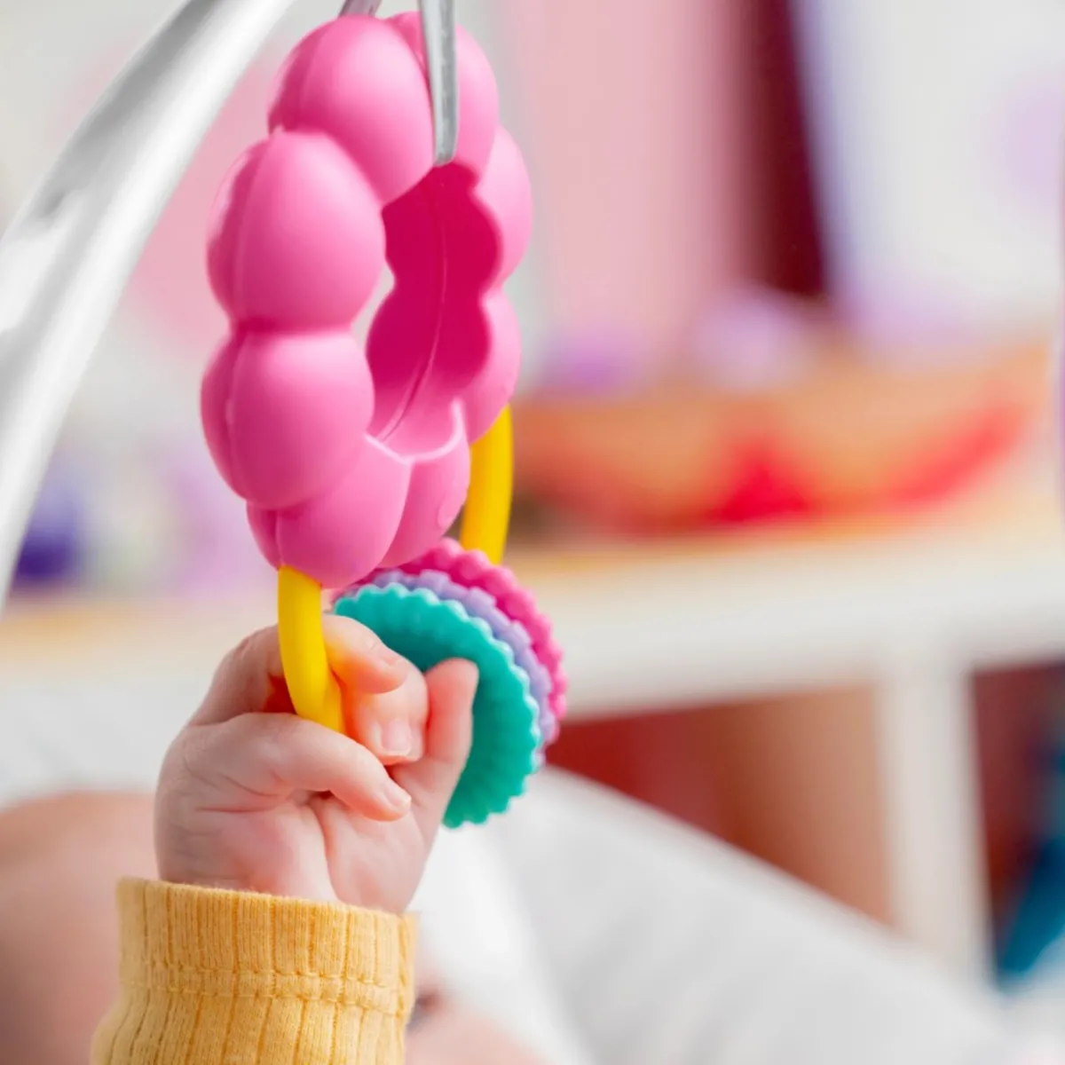 Dondolo e sdraietta Rosy Rainbow 2-in-1 di Bright Starts. Questo dolce seggiolino multiuso cresce con il bambino ed è ideale sia per i neonati che per i bambini. Gli adulti possono tranquillizzare il bambino nella modalità dondolo, mentre la barra dei giocattoli lo intrattiene dall’alto con il sonaglio a forma di cuore e il giocattolo a forma di fiore.