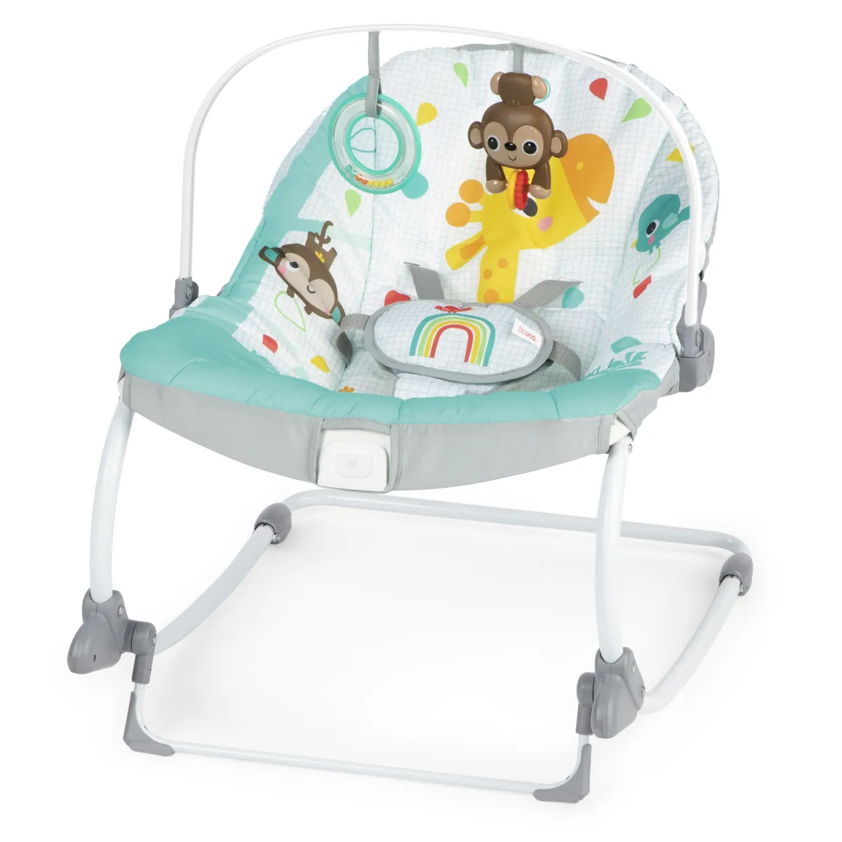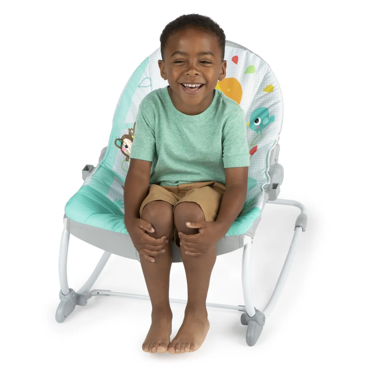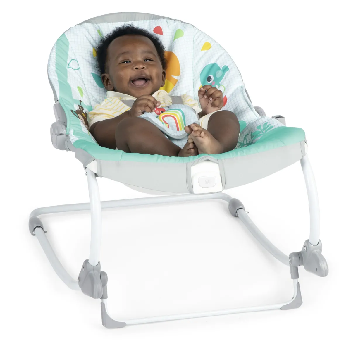 Regala al tuo piccolo selvaggio un safari rilassante con il dondolo e seggiolino fisso 2 in 1 Wild Vibes™ di Bright Starts™. Questo concentrato di potenza multi-uso cresce con il bambino ed è perfetto per neonati e bimbi più grandi! Gli adulti possono calmare il bambino nella modalità dondolo, mentre si diverte con la barra giocattolo che include un sonaglio colorato e un giocattolo a perline scorrevoli a forma di scimmietta. Le vibrazioni della sdraietta aiutano a mantenere calmo il bimbo mentre ti godi un momento a mani libere con il bimbo in vista. La funzionalità di vibrazione con un solo pulsante è integrata nel sedile, in modo da poter attivare o disattivare facilmente le vibrazioni in base alle preferenze del bambino. Per reclinare la sdraietta, utilizza i pulsanti sotto la barra giocattolo su entrambi i lati della seduta per regolarla in avanti e all’indietro. Utilizza il cavalletto anteriore per passare da dondolo a seggiolino fisso. Quando ti sposti, quando il piccolo non è nella sdraietta è sufficiente sollevarla su ciascun lato per spostarla da una stanza all’altra. Questo sedile tuttofare cresce con il bimbo fino a 18 kg, così potrai usarlo come dondolo per neonati e come seggiolino per bambini quando cresce! Goditi un po’ di tempo con questo dondolo con cuscinetto rimovibile lavabile in lavatrice, a prova di qualsiasi pasticcio. Il regalo perfetto per un baby shower o per celebrare l’arrivo di un bebè!