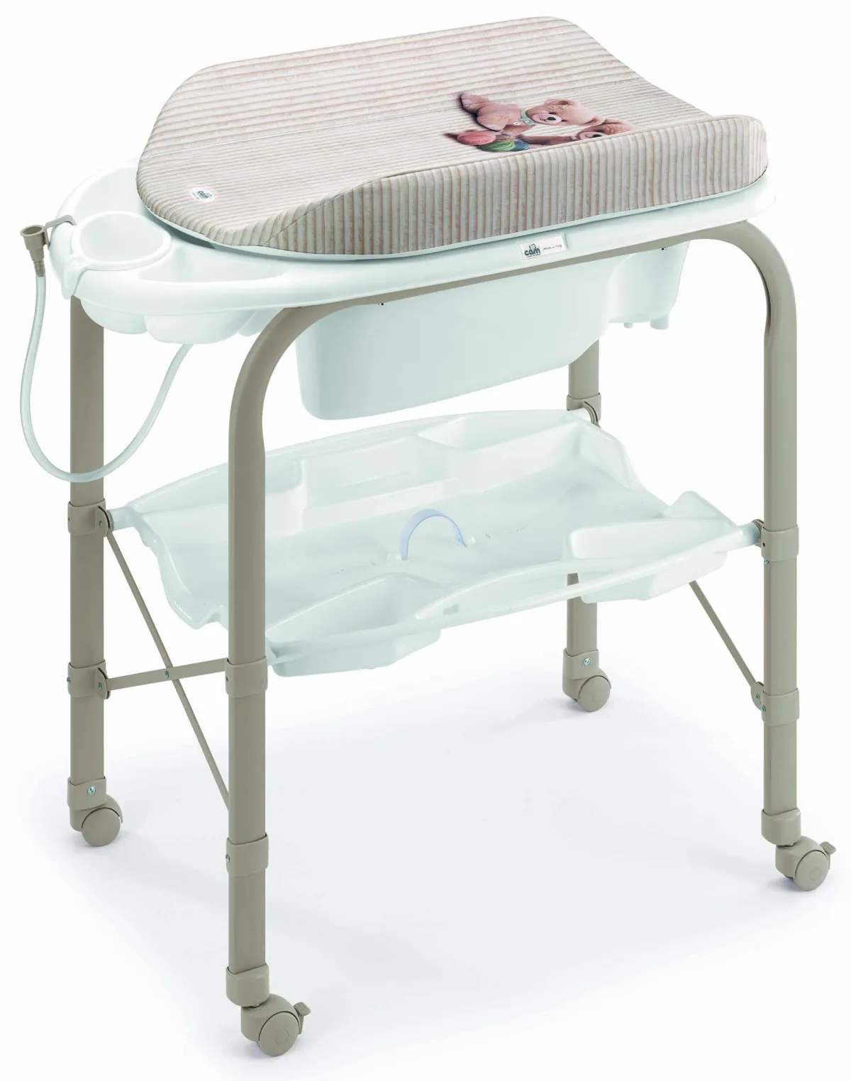 Morbido fasciatoio con sistema di anti-ribaltamento, include vaschetta Baby Bagno con 2 sedute anatomiche e antiscivolo (una inclinata per bimbi da 0 a 6 mesi e una seduta con braccioli per bimbi da 6 a 12 mesi)