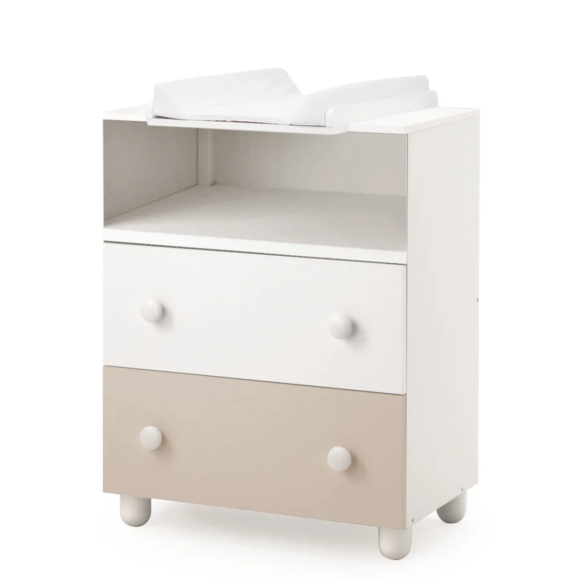 Dotata di piano di cambio superiore “fronte mamma” e fasciatoio pvc bianco per la massima igiene durante le operazioni di cambio del pannolino.