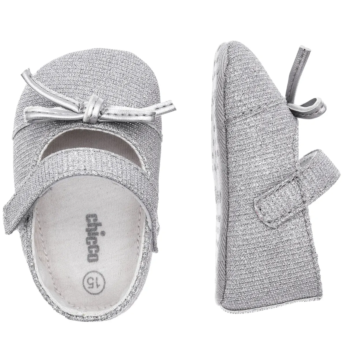 Ballerina Chicco per neonata con velcro per facilitare la calzata, impreziosita da un fiocchetto argento. Adatta alle occasioni speciali
