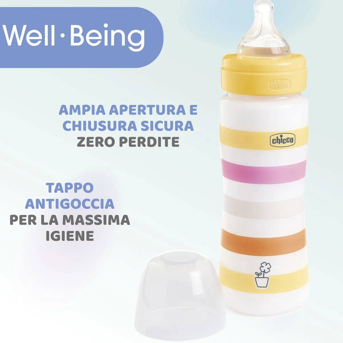- Il Biberon Well-Being Chicco 330ml in plastica garantisce la massima praticità grazie alla forma ergonomica, è adatto per la sterilizzazione ed è lavabile in lavastoviglie.