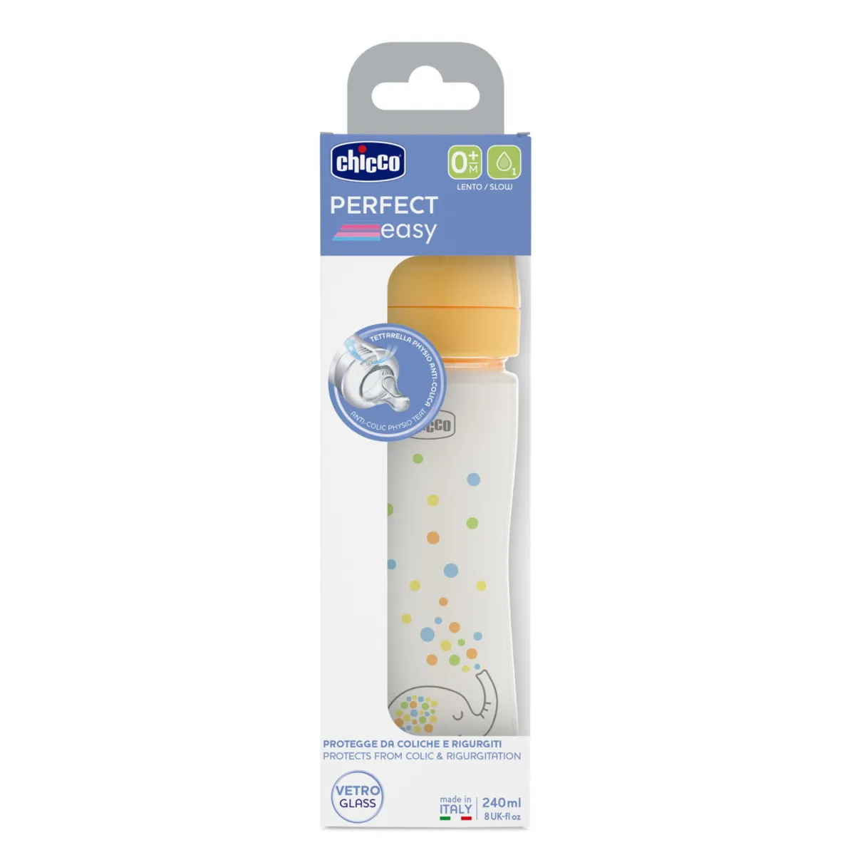 Il Biberon Perfect Easy 240ml in Vetro Chicco è stato ideato in ogni dettaglio per rendere più facile e sicura l’alimentazione quotidiana del tuo bambino. La tettarella in silicone super morbida con finiture Soft Sense, agevola l’accettazione del biberon da parte di 9 bimbi su 10, creando una sensazione piacevole e naturale. La sua speciale forma ergonomica, inoltre, si adatta alla perfezione alla bocca del bambino e, stimolando la corretta peristalsi della lingua, riduce l’insorgere di coliche, rigurgito o irritabilità. Il Biberon Perfect Easy 240ml in vetro Chicco è realizzato in vetro borosilicato, resistente agli shock termici e al calore. Lavabile in lavastoviglie e adatto alla sterilizzazione, mantiene inalterate le proprietà del contenuto. Il biberon è inoltre dotato di una chiusura ermetica e salvagoccia che garantisce igiene ed evita perdite, e di un’apertura ampia che ne consente una pulizia e un riempimento facile e veloce. Dotato di tettarella intercambiabile.