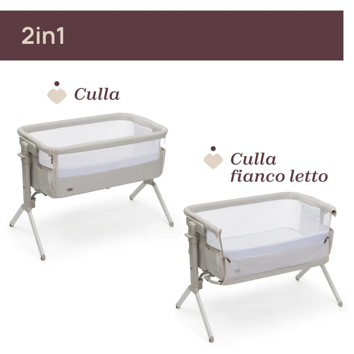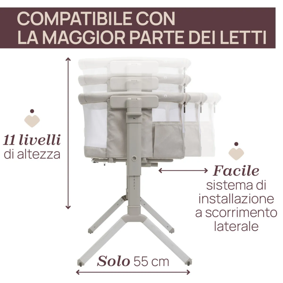 La culla può essere regolata in altezza su 11 diversi livelli, per adattarsi ad ogni tipo di letto.