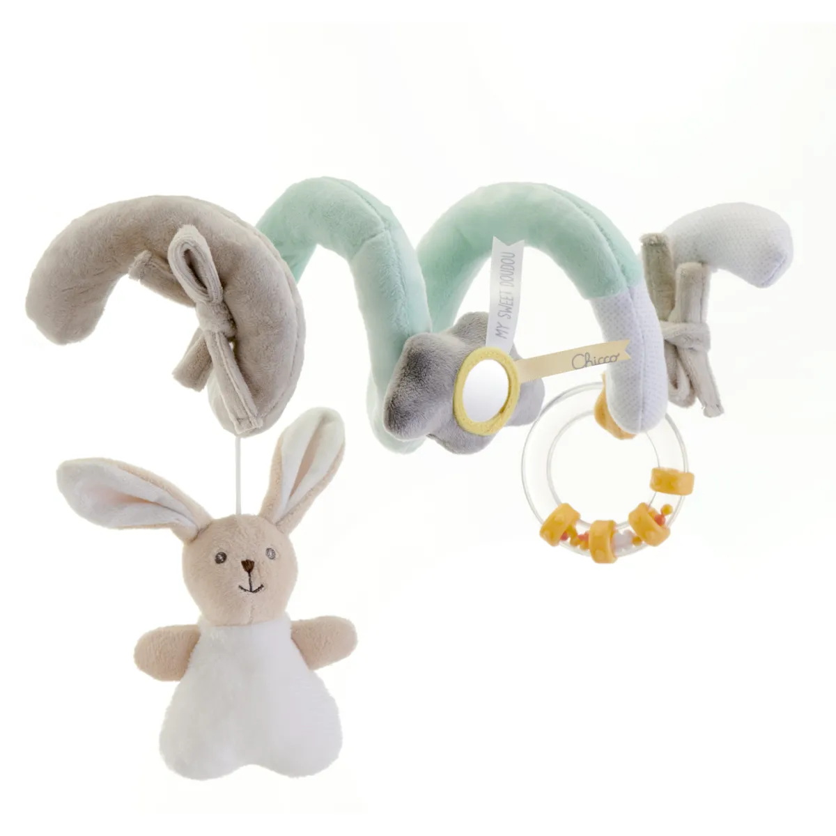 Dona al piccolo momenti di divertimento durante i suoi viaggi in passeggino o carrozina! Grazie alla fune da passeggio in tessuto morbido, il piccolo sarà intrattenuto da 3 attività di gioco: 1. Pupazzetto coniglio 2. Nuvola con specchietto 3. Trillino ad anello Grazie ai laccetti laterali, è possibile fissarla in modo saldo al passeggino o alla carrozzina.