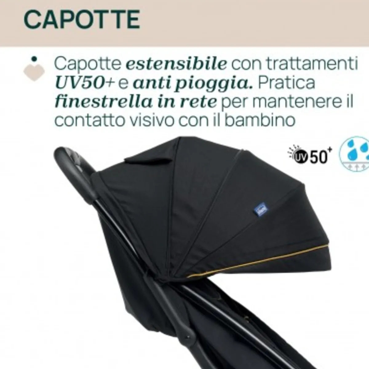 La cappottina di protezione presenta una parte estensibile ed è dotata di parasole. La stessa viene sottoposta a trattamenti UV50+ e idrorepellenti.
