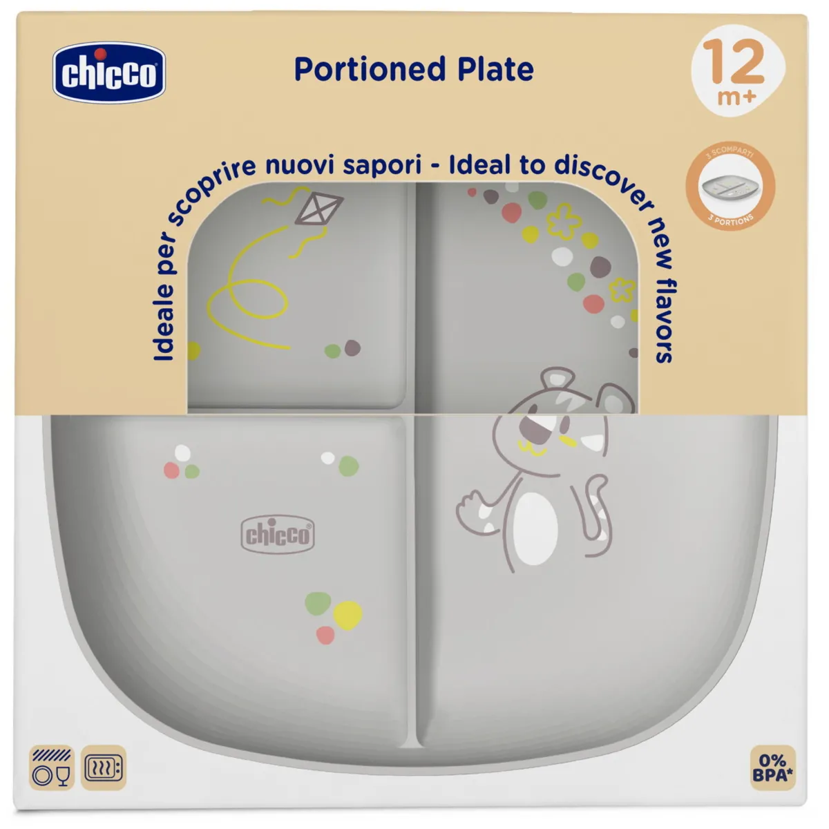 Il Piatto Porzionato Grigio di Chicco è realizzato con polipropilene resistente, di lunga durata e facile da pulire, anche in lavastoviglie.