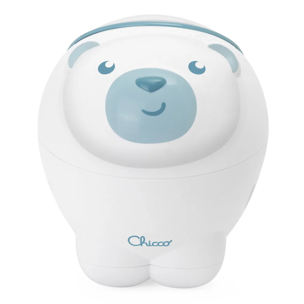 Orso Polare Azzurro della linea First Dreams di Chicco è un proiettore con effetti luminosi e melodie, ideale per creare un’atmosfera rilassante per il riposo del bambino. Può essere utilizzato sia come proiettore da agganciare alla culla che come proiettore da appoggiare sul comodino. Può proiettare l’aurora boreale per 30 minuti insieme a musica classica e suoni della natura. Ha due pulsanti, uno per selezionare le melodie e uno per attivare o disattivare la proiezione.