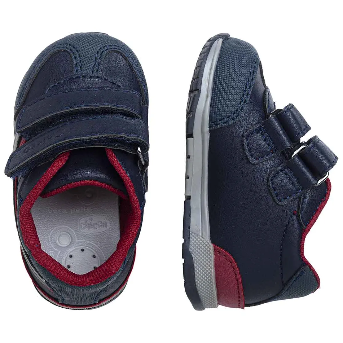 Comoda scarpa con particolari rossi e grigi e con comodo doppio velcro.