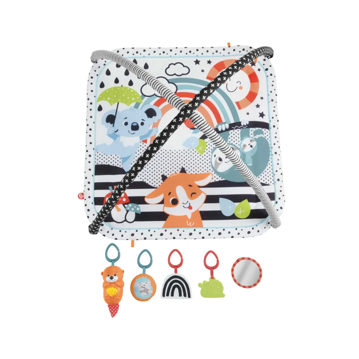 La Palestrina Luci e Suoni degli Amici Animali 3-in-1 Fisher-Price 3-in-1 è il posto dove il divertimento si ‘accende’. I neonati possono allungarsi per raggiungere, afferrare e mordicchiare i 5 giocattoli, tra cui uno specchietto, un morbido riccio tintinnante, una lumachina dentaruolo senza BPA, un arcobaleno frusciante e una lontra con musica e luci. La lontra riproduce 15 minuti di musica ed emana una luce soffusa per regalare tanto divertimento al tuo bambino sia sul tappetino che a spasso! E una volta che inizia a crescere, basta rimuovere i due archi utilizzati per farlo giocare disteso a pancia in giù, così potrà cercare di sollevarsi sulle mani e ginocchia per rinforzare i muscoli del collo e dell’addome. Inoltre, i colori ad alto contrasto della palestrina favoriscono lo sviluppo della vista.