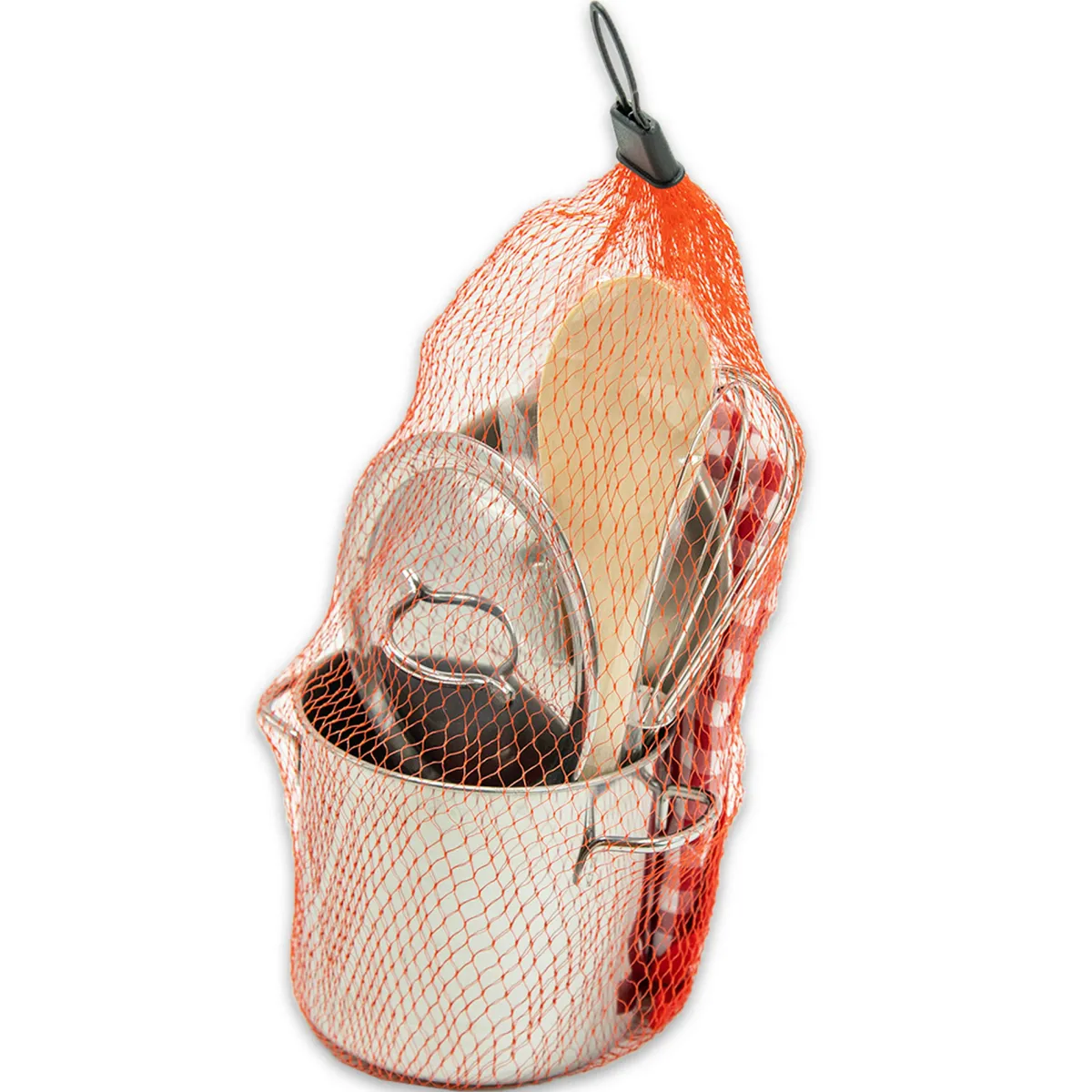 Set da cucina realizzato in metallo: 2 pentole con coperchi, 1 padella, 2 utensili, 1 guanto da forno.