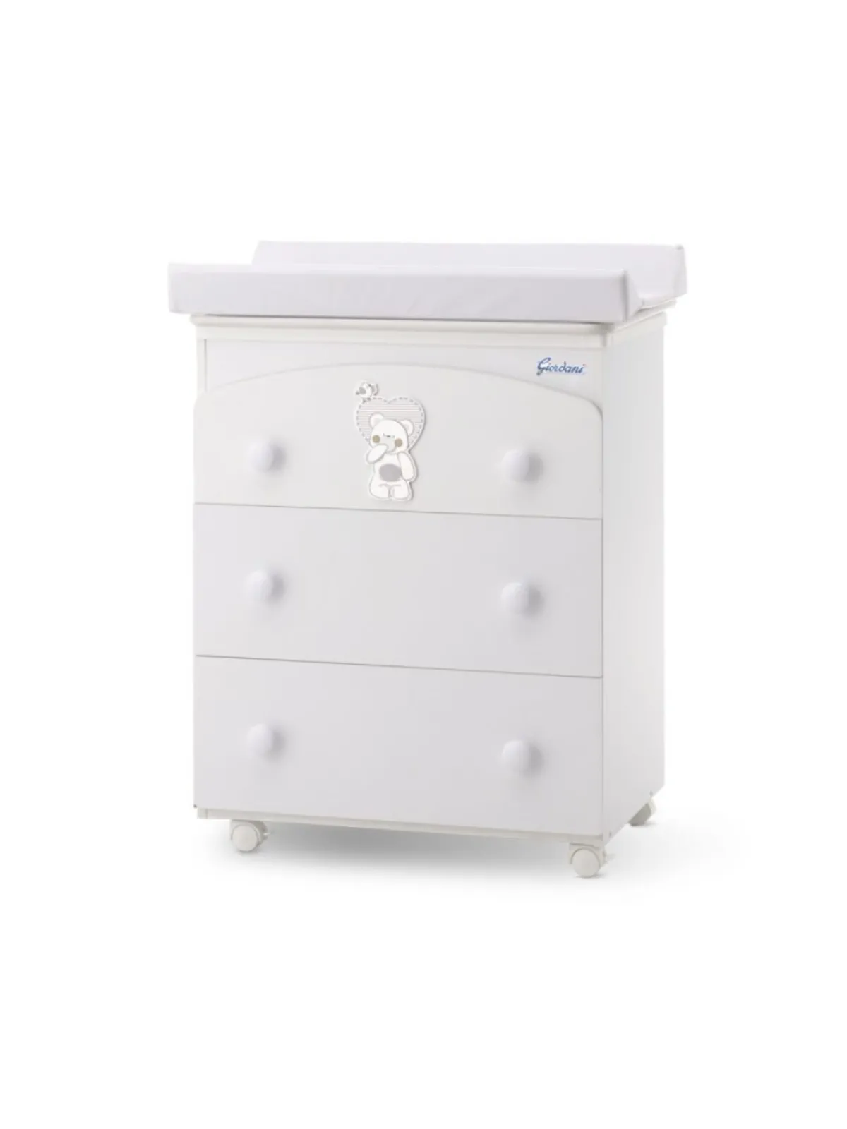 Realizzato con pannelli di truciolare nobilitato e un’applicazione di cuore orsetto. 4 ruote piroettanti d cui 2 con freno. Fasciatoio in PVC di colore bianco, vaschetta sagomata utilizzabile su due altezze con portasapone incorporato. Cannuccia per svuotare la vaschetta e doppio tappo di sicurezza.