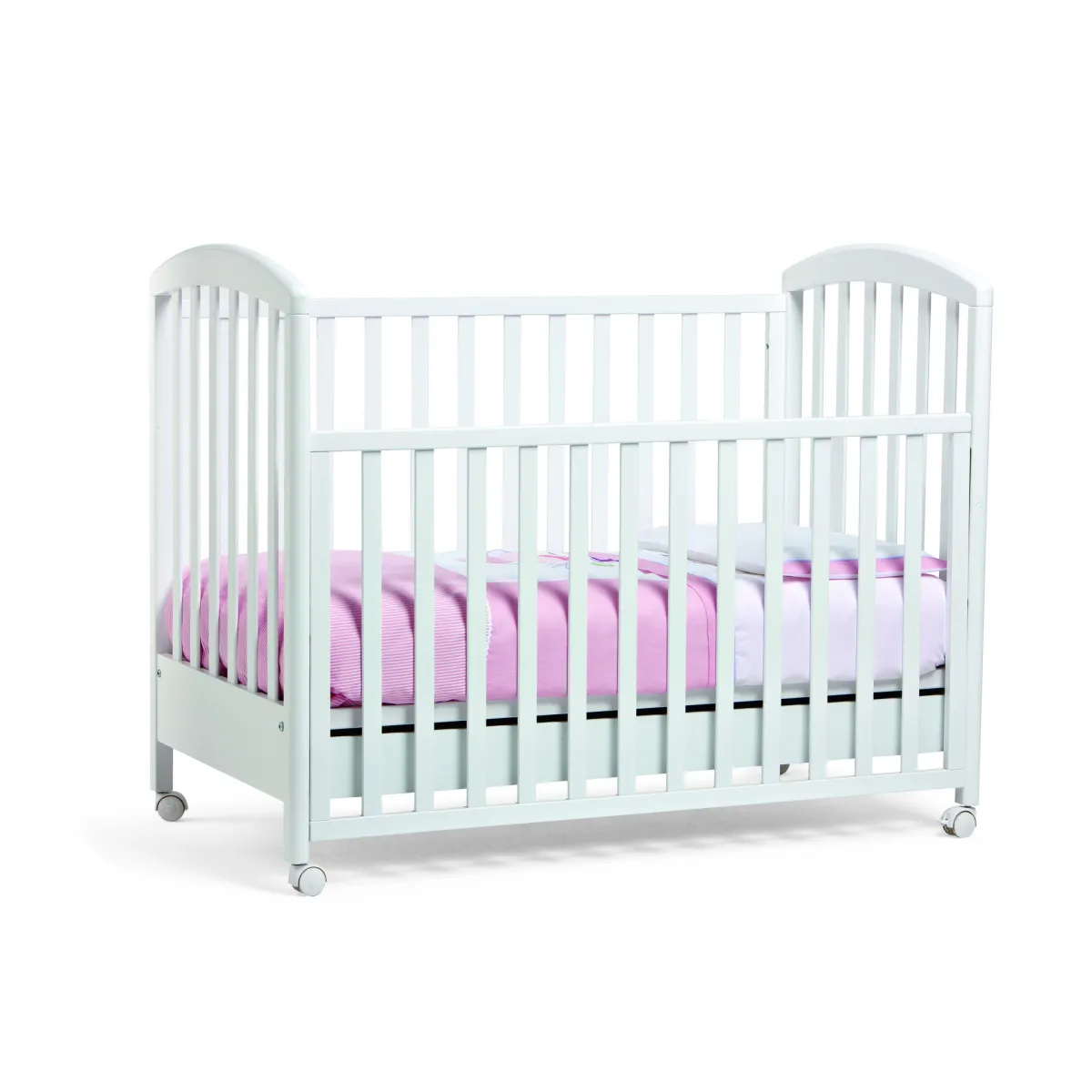 Con una solida struttura in legno bianco, questo grazioso lettino è dotato di una spondina regolabile in altezza; la rete è a doghe, mentre nella parte inferiore si trova un praticissimo cassetto estraibile, che potrà contenere tutti i corredini di ricambio.