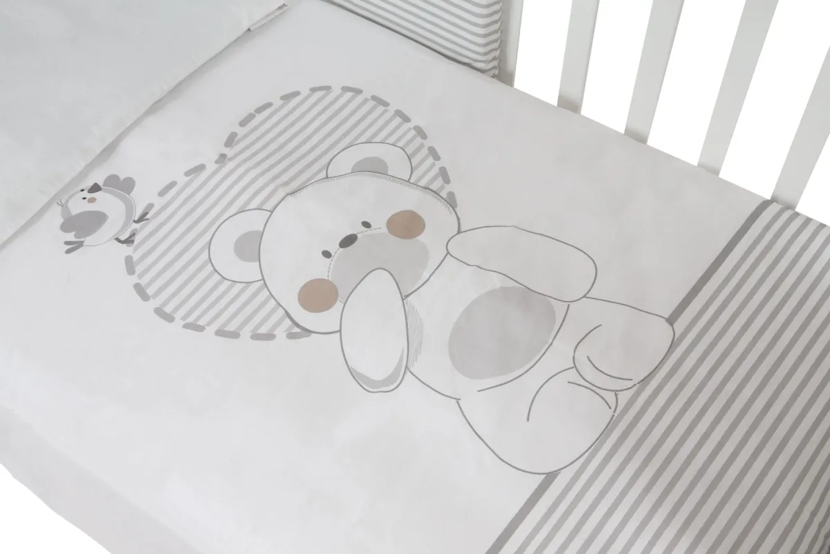 Set lettino composto da federa, copri piumone, piumone e paracolpi. Orsetto stampato per un perfetto coordinamento con il lettino Alice di Giordani, che al lettino Leivonnaiset