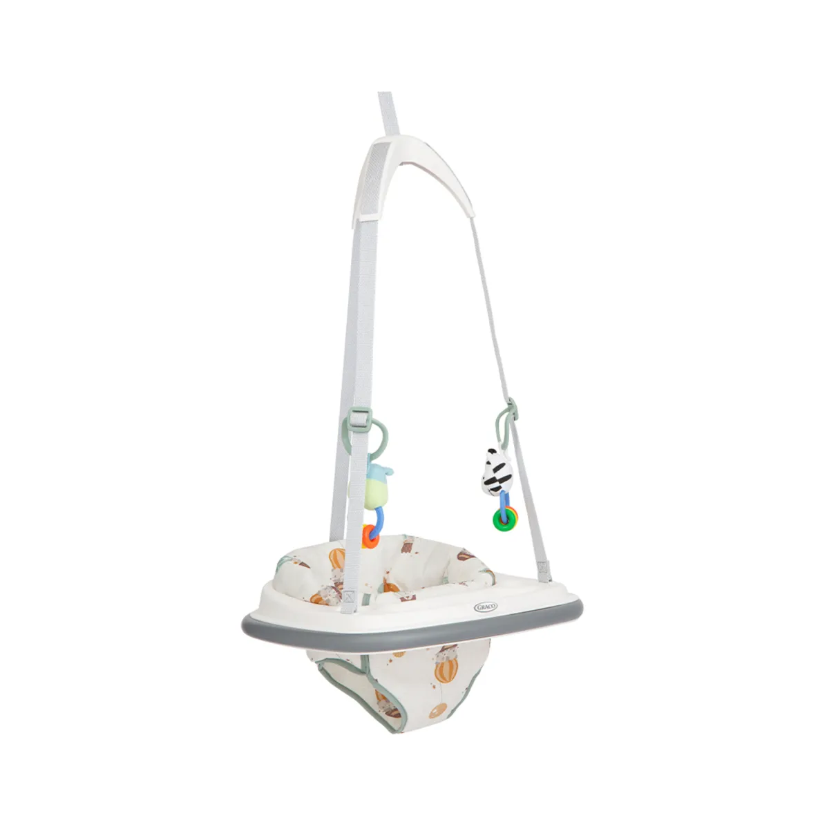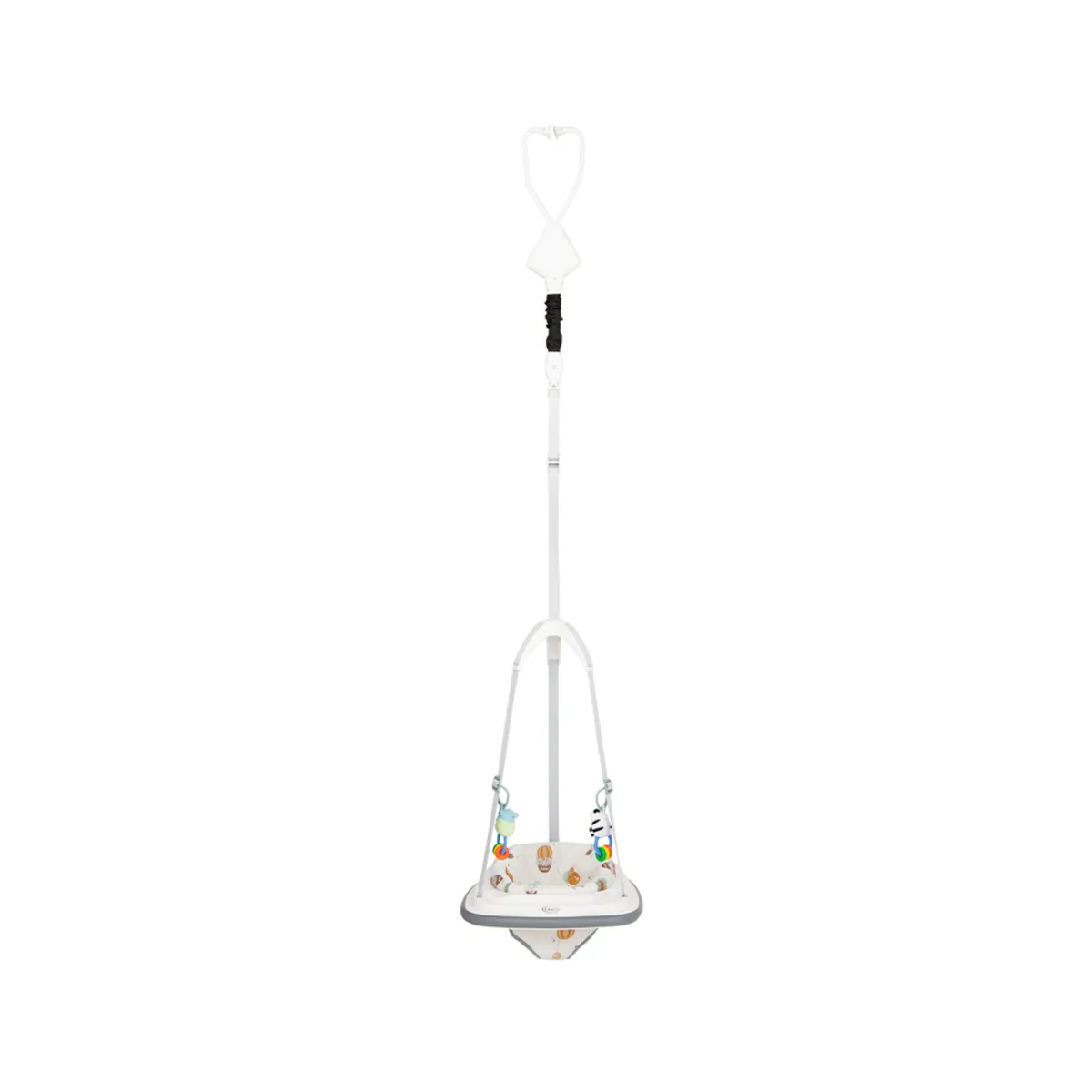 Robusta molla di rimbalzo con cordino di sicurezza nascosto. Il vassoio gioco offre al bambino un posto dove giocare con i giocattoli per maggiori opzioni di intrattenimento.