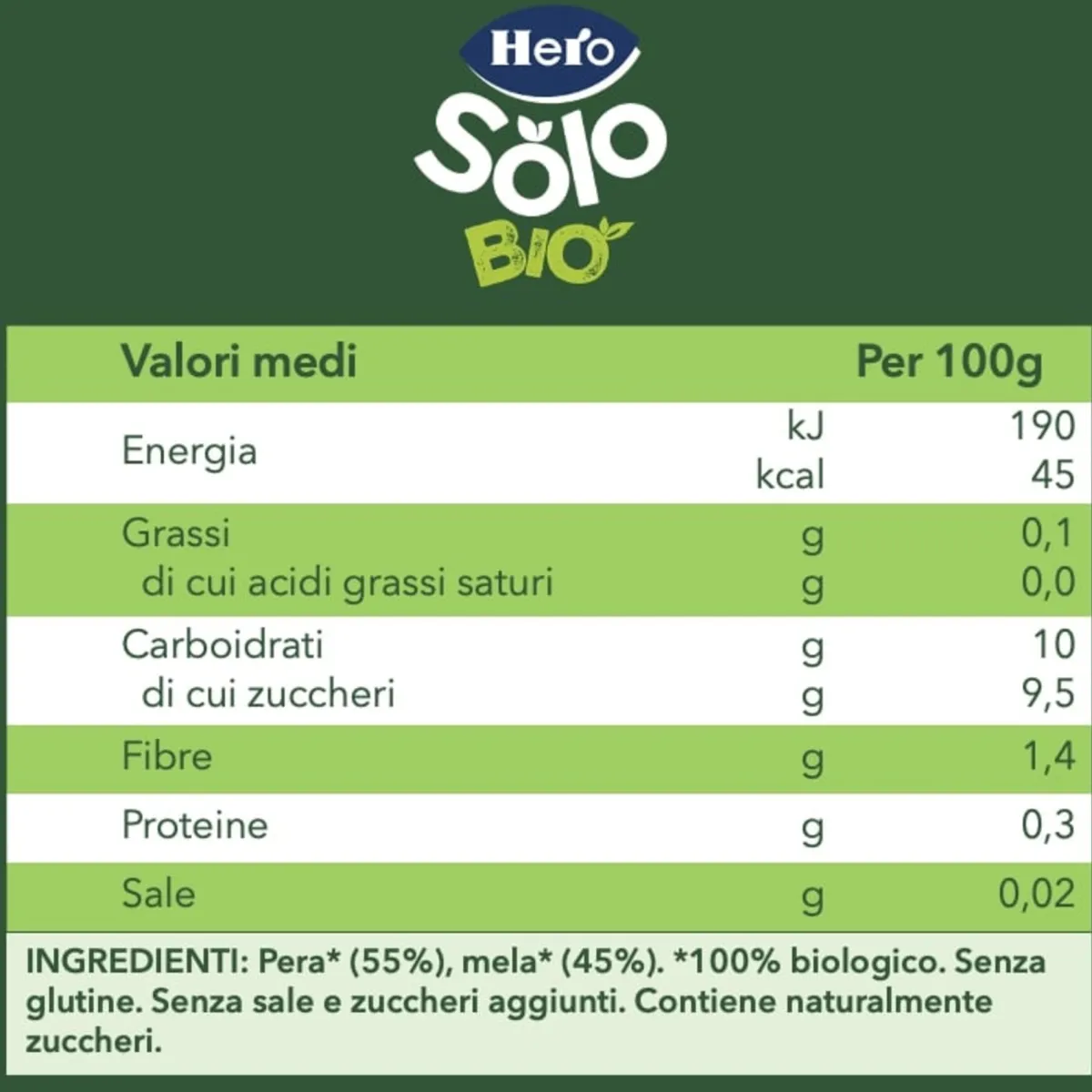 Hero Baby Solo Pera e Mela è una ricetta semplice preparata con solo frutta, nata per accompagnare i più piccoli alla scoperta graduale di nuovi sapori assecondando il naturale sviluppo della loro prima infanzia. Indicato dai 4 mesi.
