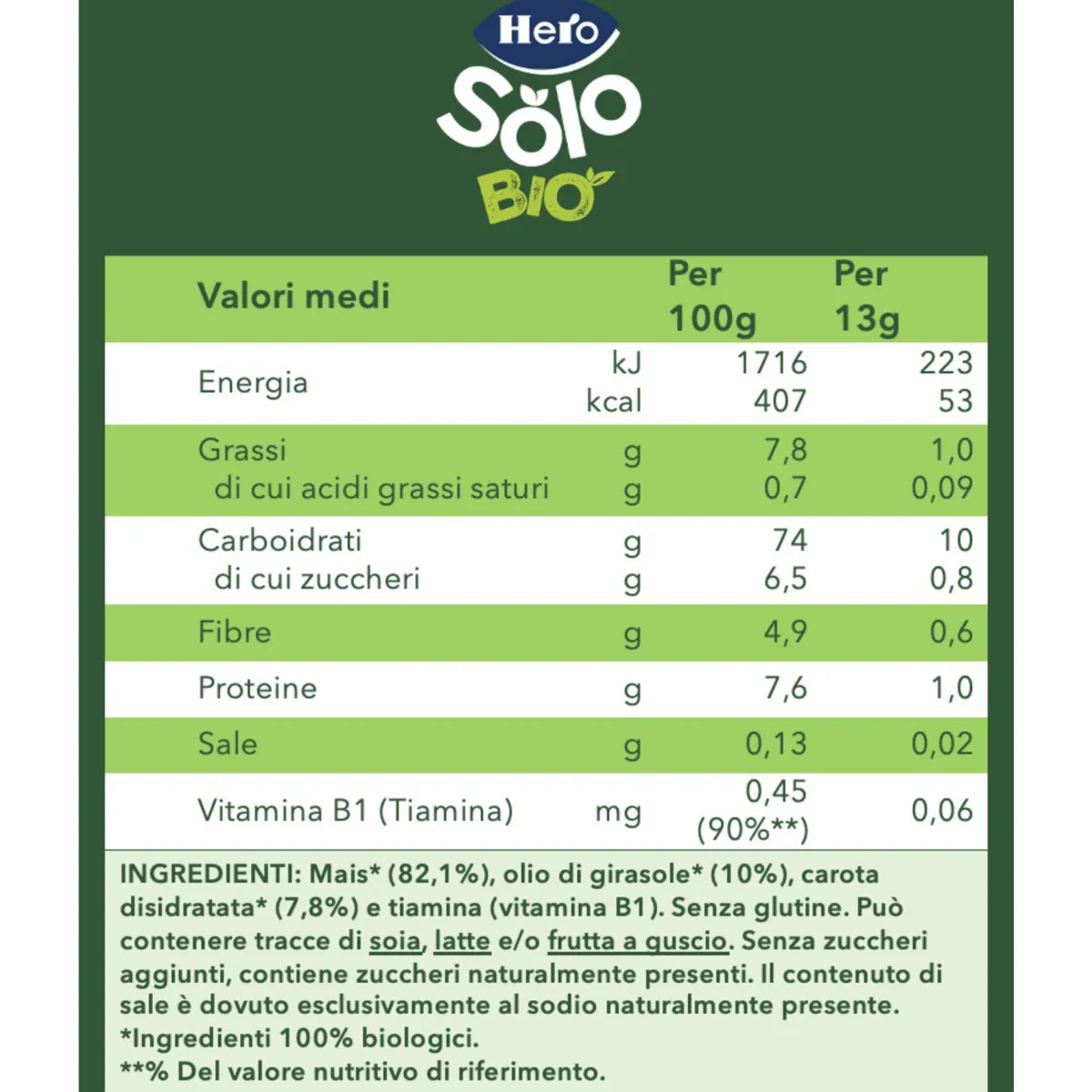 Gli Snack Carota e Mais Hero Solo sono fatti con solo carota e mais biologici. Non fritti, senza olio di palma e senza glutine. A partire dai 10 mesi. Hero Solo Snack Carote e Mais biologici contiene solo cereali e verdure 100% biologici, e niente più. Ricorda: il tuo bambino è pronto a mangiare questi spuntini quando sta seduto da solo, mastica da solo e quando è accompagnato da un adulto.