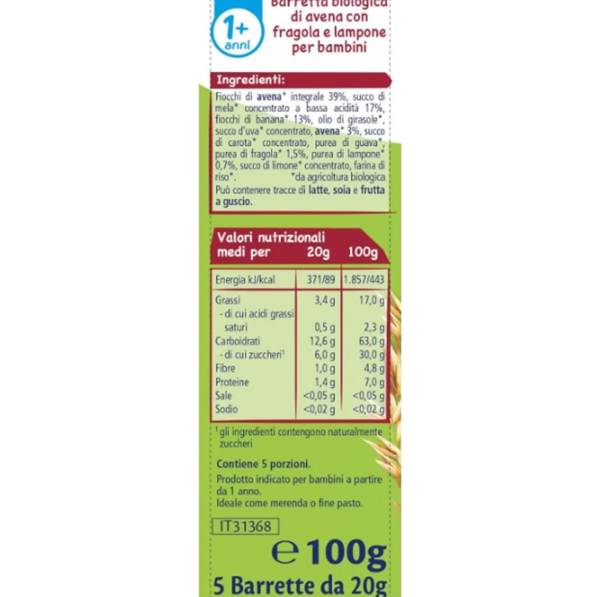 Ingredienti:Fiocchi di avena* integrale 39%, succo di mela* concentrato a bassa acidità 17%, fiocchi di banana* 13%, olio di girasole*, succo d’uva* concentrato, avena* 3%, succo di carota* concentrato, purea di guava*, purea di fragola* 1,5%, purea di lampone* 0,7%, succo di limone* concentrato, farina di riso*. *da agricoltura biologica