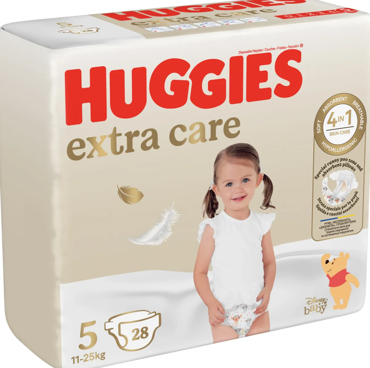 Huggies Extra Care è la nostra migliore protezione per la pelle delicatissima del neonato. I morbidissimi cuscinetti assorbenti assorbono il bagnato e la pupù liquida, la capiente tasca posteriore e le doppie barriere, posizionate sulle gambe ,aiutano ad evitare le fuoriuscite. Sono ipoallergenici e dermatologicamente testati per offrire la massima cura di cui ha bisogno la pelle del tuo bambino.