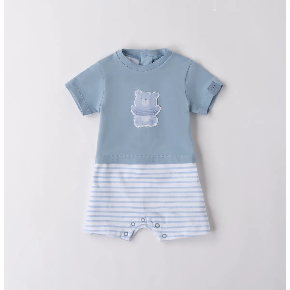Pagliaccetto per neonato iDO in jersey elasticizzato di cotone. Il modello presenta apertura sul retro e nel sottogamba con bottoni a pressione per agevolare il cambio e la vestizione. Il pagliaccetto è in fantasia tinta unita nella parte superiore e in fantasia a righe nella parte inferiore. Scegliendo i nostri prodotti in cotone, sostieni il nostro investimento nella missione Better Cotton. La fornitura di questo prodotto avviene tramite un sistema di bilancio di massa e potrebbe non contenere Better Cotton. Leggi di più su bettercotton.org/massbalance Scopri tutta la selezione tutine per neonato 0-18 mesi firmata iDO!