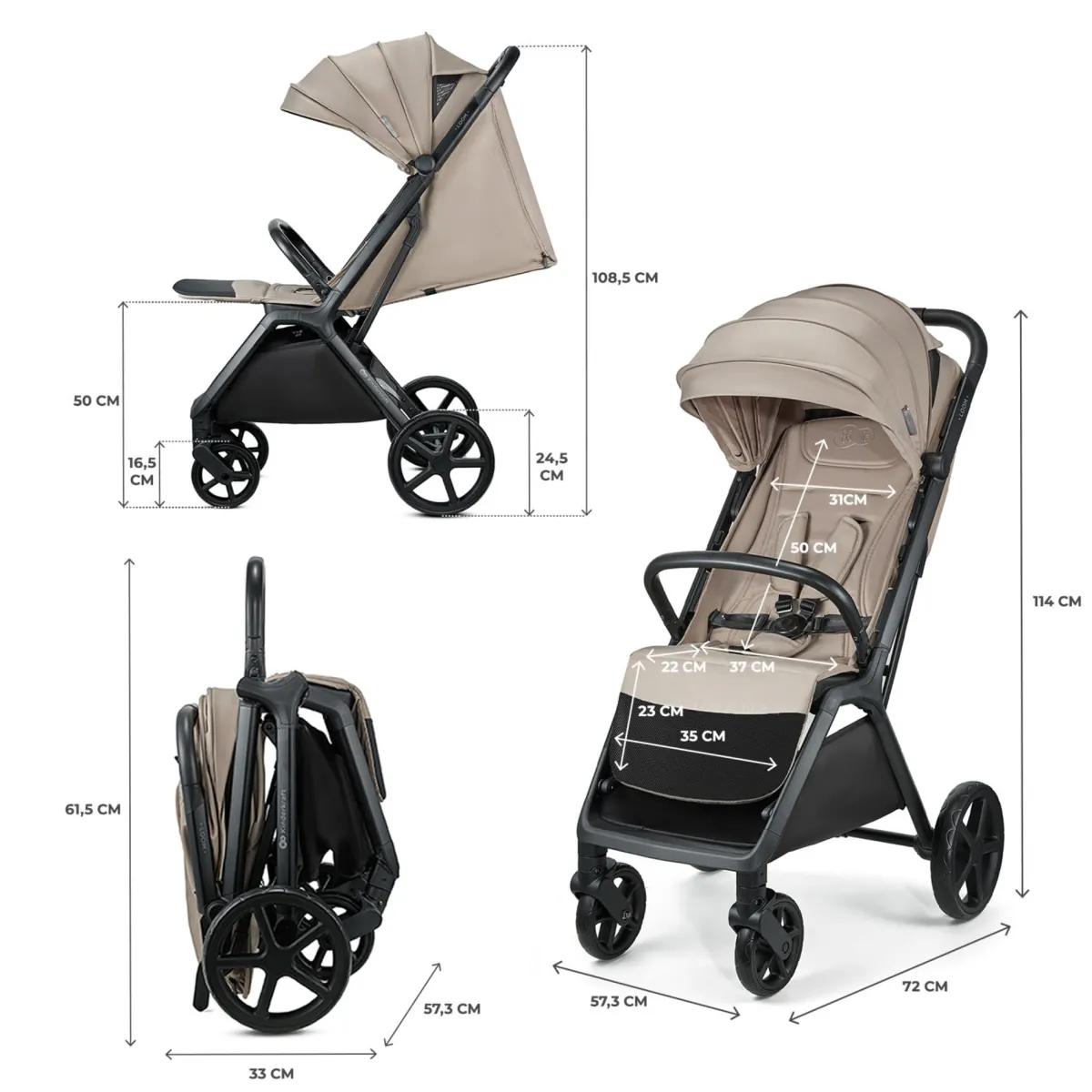 La capottina protegge da sole e vento, mentre i pannelli di ventilazione garantiscono un’adeguata circolazione dell’aria, assicurando il massimo comfort in ogni stagione.Il passeggino è dotato di uno schienale regolabile e di due livelli per il poggiapiedi, mentre la barriera girevole a 360° per facilitare le azioni di accomodare e riprendere il bambino dal passeggino.