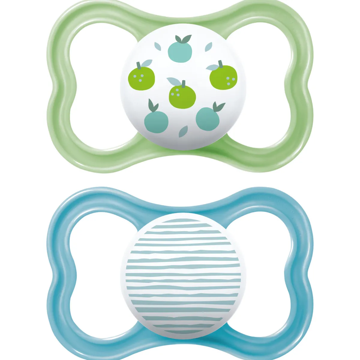 Mam Air set da 2 ciucci in caucciù, bio-circolare – ciuccio morbido grazie al design innovativo. La pelle dei bimbi è particolarmente sensibile e si irrita facilmente, con il set da 2 ciucci Mam ha voluto creare un prodotto anti-irritazione.