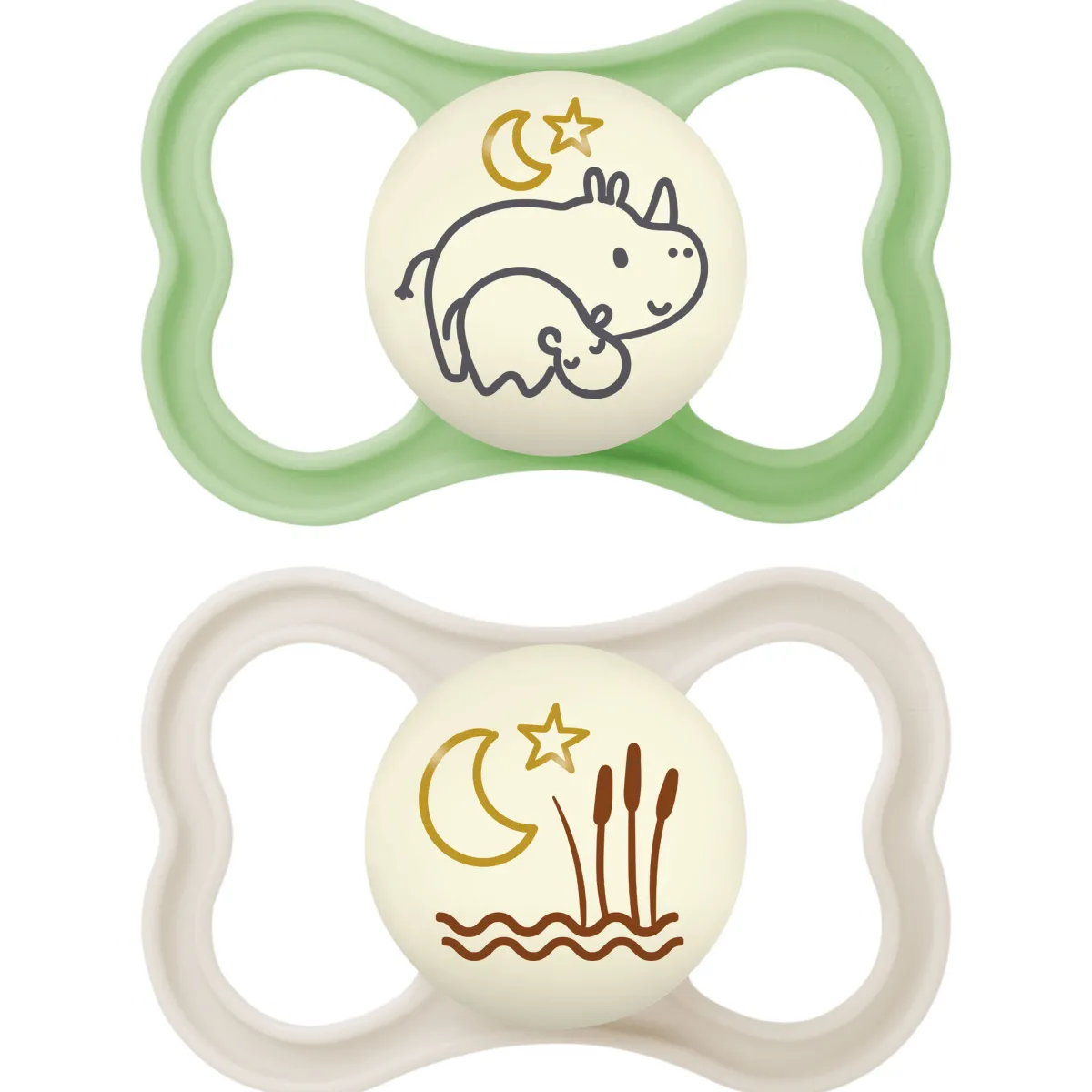 Mam Air night set da 2 ciucci in silicone – ciuccio morbido grazie al design innovativo e al bottone che si illumina al buio il set da 2 ciucci Mam Air Night è la componente perfetta per ogni kit di accessori dedicati ai più piccoli.