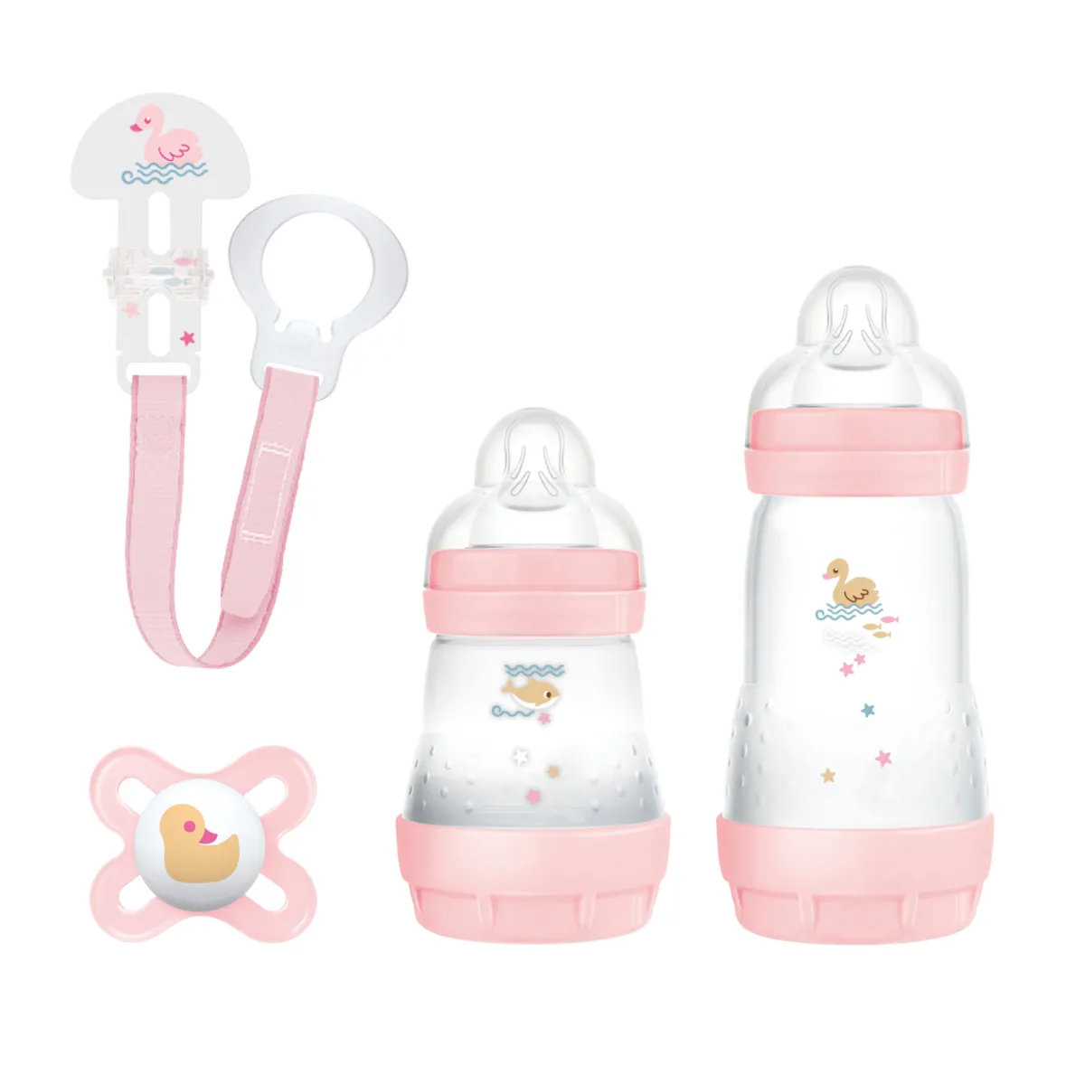 La nascita di un bebè è un avvenimento davvero speciale e anche il regalo dovrebbe esserlo. Il set per neonati MAM Welcome to the World comprende tutto il necessario per festeggiare il lieto evento, si compone di 3 biberon MAM Anti-Colic (2 x 160 ml, 1 x 260 ml), ciuccio MAM Start Nanò, e di un portaciuccio Clip & Cover.