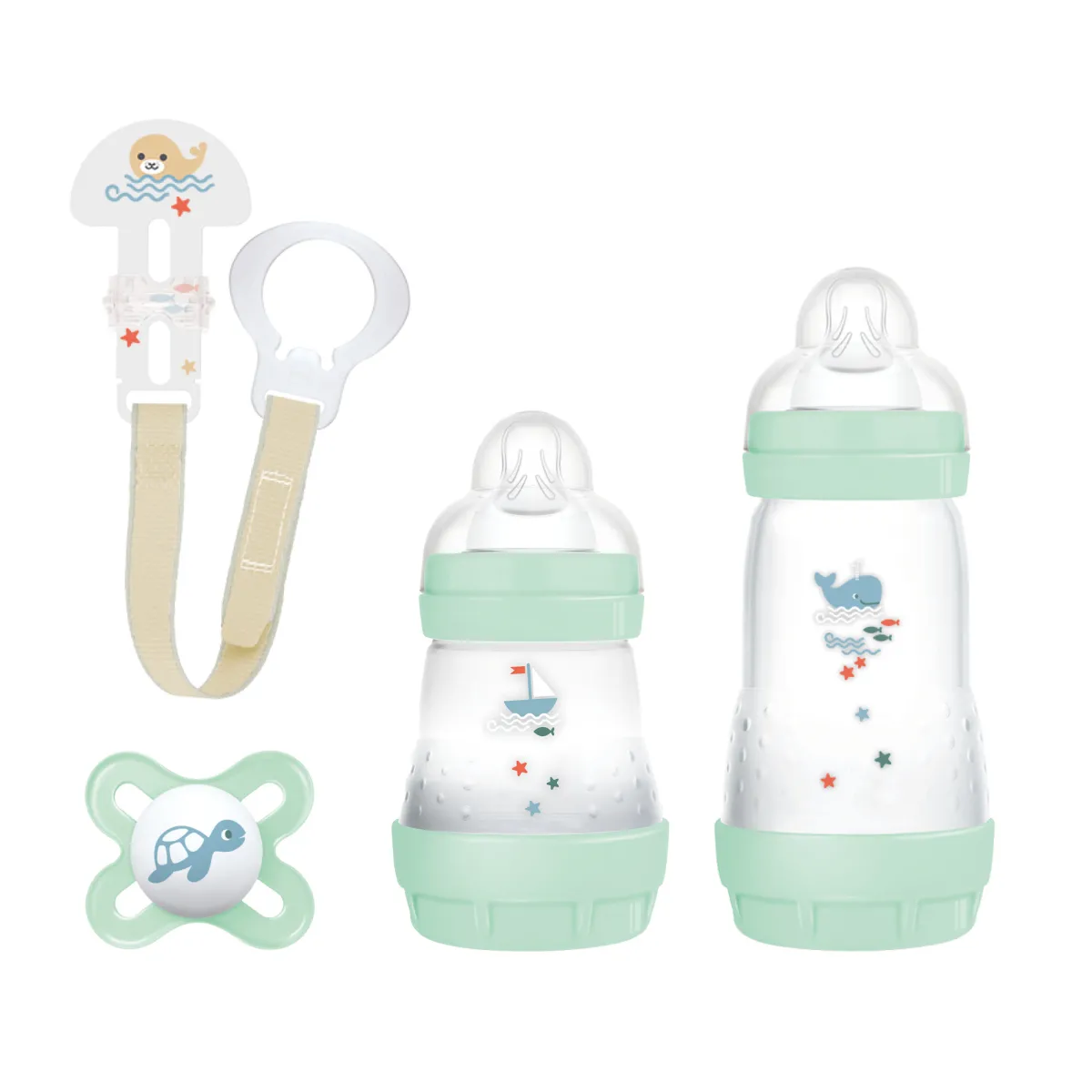 La nascita di un bebè è un avvenimento davvero speciale e anche il regalo dovrebbe esserlo. Il set per neonati MAM Welcome to the World comprende tutto il necessario per festeggiare il lieto evento, si compone di 3 biberon MAM Anti-Colic (2 x 160 ml, 1 x 260 ml), ciuccio MAM Start Nanò, e di un portaciuccio Clip & Cover.
