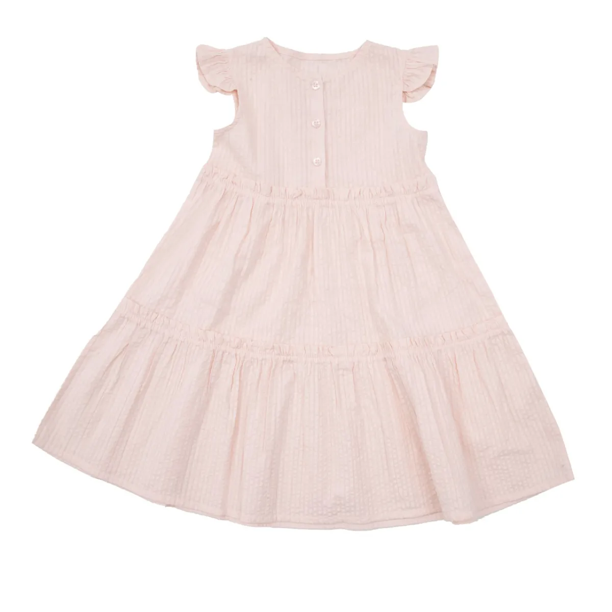 Tenero vestito estivo da bambina a giromanica. Il capo si presenta in tinta unita rosa antico con trama semplice; sotto la vita in un pezzo unico la gonna morbida a balze. Modelllo girocollo. La vestibilità è morbida e pratica grazie alla presenza di bottoni classici sul davanti. Accessori non in vendita. La confezione contiene solo il capo di abbigliamento