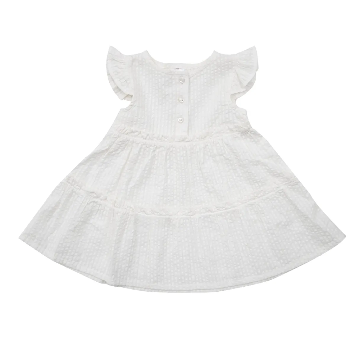 Tenero vestito estivo da bambina a giromanica. Il capo si presenta in tinta unita bianco con trama semplice; sotto la vita in un pezzo unico la gonna morbida a balze. Modelllo girocollo. La vestibilità è morbida e pratica grazie alla presenza di bottoni classici sul davanti. Accessori non in vendita. La confezione contiene solo il capo di abbigliamento