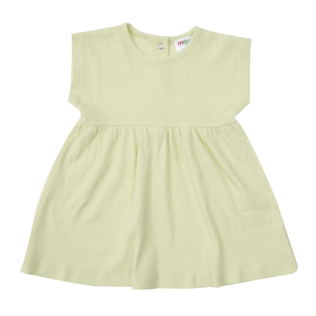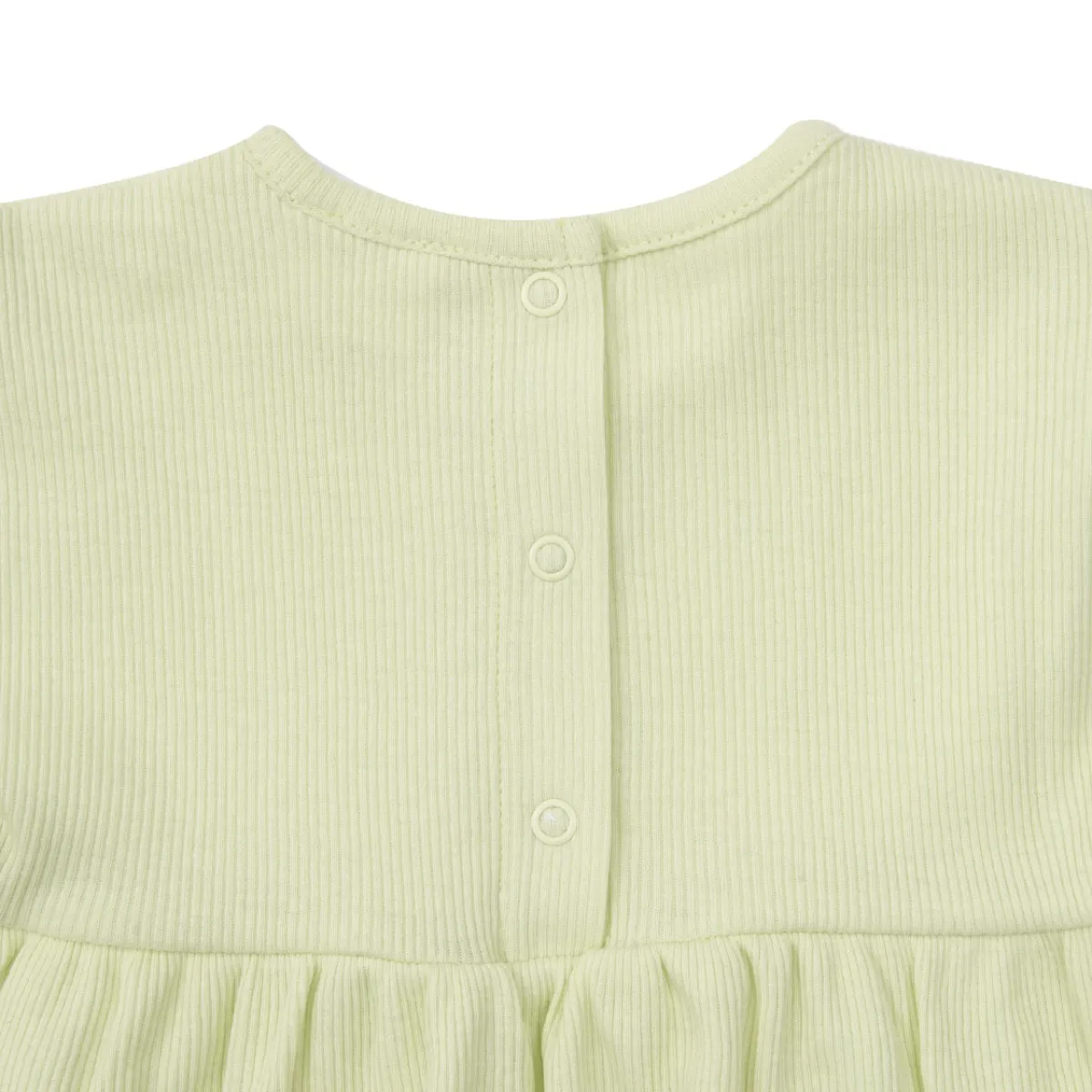 Tenero vestito a costina da bambina. Il capo si presenta in tinta unita verde; sotto la vita in un pezzo unico la gonna a pieghe morbide. Modelllo giromanica. La vestibilità è morbida e pratica grazie ai bottoni a clip sulla schiena. Accessori non in vendita. La confezione contiene solo il capo di abbigliamento