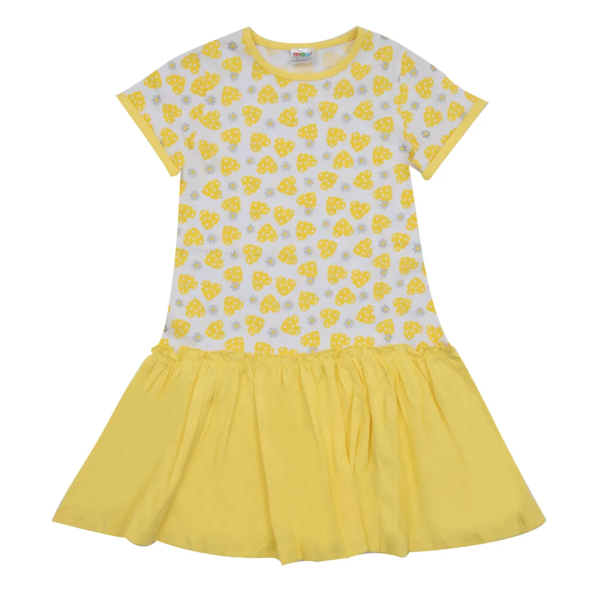 Tenero vestito estivo da bambina a mezza manica. Il capo si presenta in colorazione bianco-giallo con stampa allover cuori; sotto la vita in un pezzo unico la gonna morbida a pieghe. Modelllo girocollo. La vestibilità è morbida. Accessori non in vendita. La confezione contiene solo il capo di abbigliamento