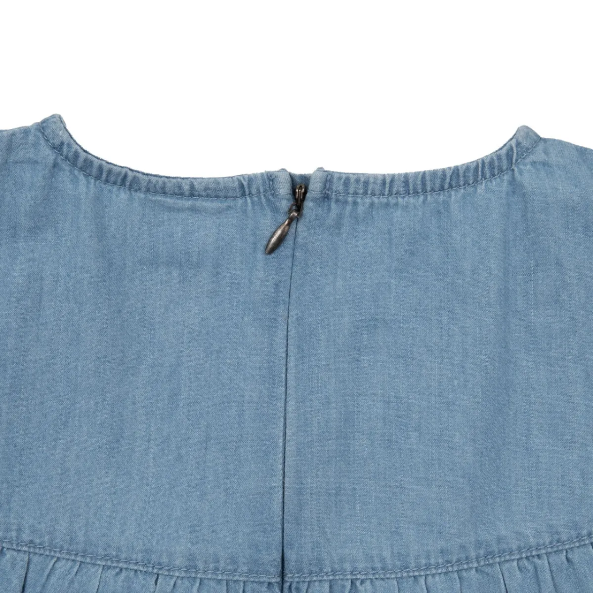 Tenero vestito estivo da bambina a giromanica. Il capo si presenta in colorazione blu denim; sotto la vita in un pezzo unico la gonna morbida a balze. Modelllo girocollo con frill lungo il giromanica. La vestibilità è morbida e pratica grazie alla presenza di cerniera sulla schiena. Accessori non in vendita. La confezione contiene solo il capo di abbigliamento