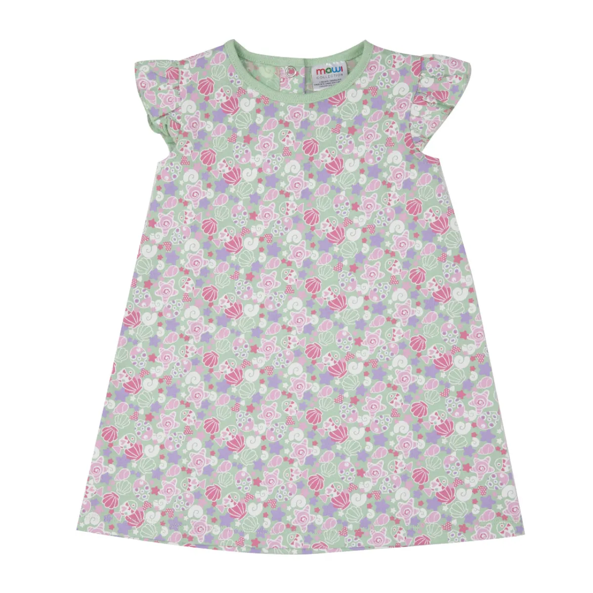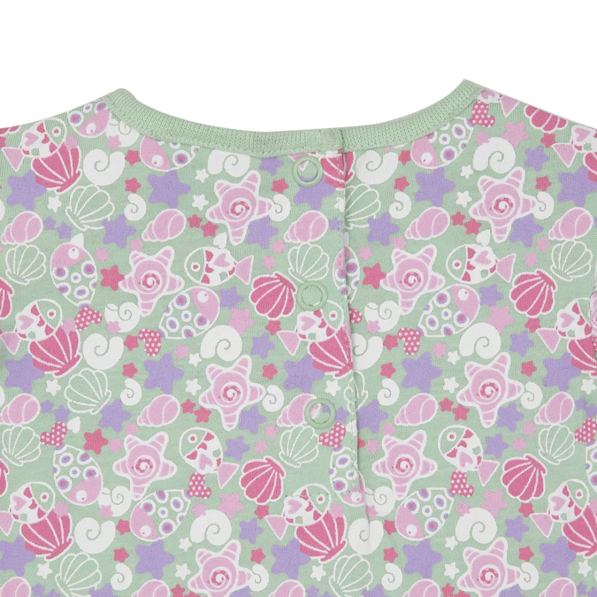 Tenero vestito estivo da bambina a giromanica. Il capo presenta su sfondo verde chiaro una stampa allover a tema marino nelle varianti del rosa e lilla; sotto la vita in un pezzo unico la gonna morbida semplice. Modelllo girocollo. La vestibilità è morbida e prarica grazie ai bottoni a clip sulla schiena. Il vestito semplice è adatto per diverse occasioni. Accessori non in vendita. La confezione contiene solo il capo di abbigliamento