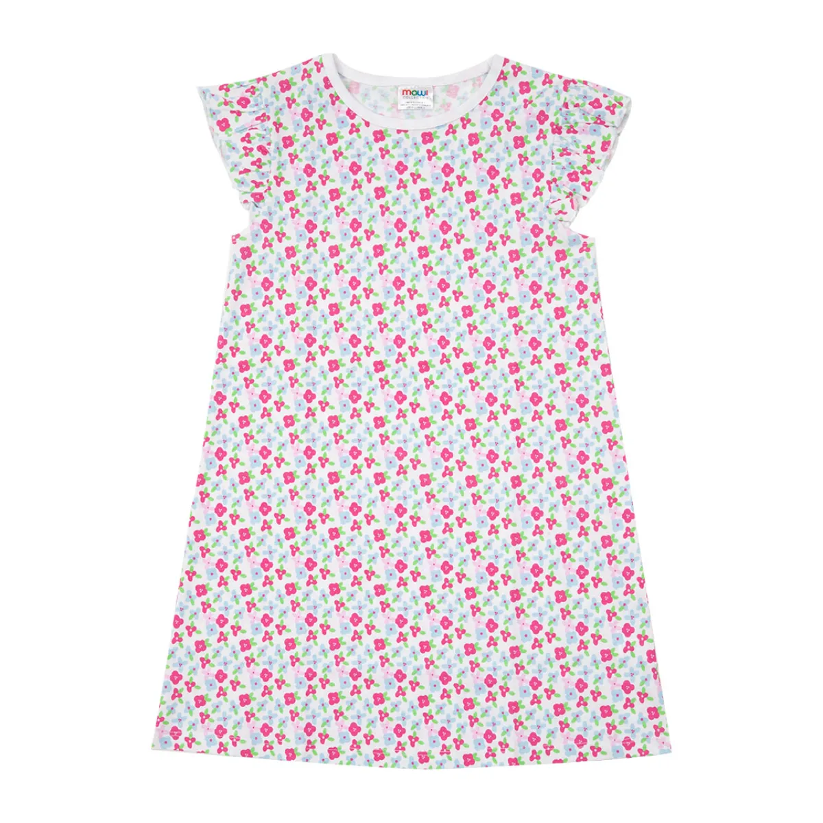 Fresco vestito estivo da bambina. Il capo si presenta con base bianca estampa allover multicolor floreale; sotto la vita in un pezzo unico la gonna morbida larga. Modelllo a canottiera con frill sul giromanica. La vestibilità è morbida.