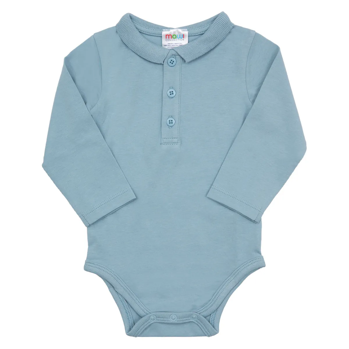 Body jersey stretch a maniche lunghe da bambino. Il capo basico si sviluppa in monocolore azzurro più colletto alla peter pan. La vestibilità è morbida e semplice grazie a tre bottoni classici sul davanti e a clip sul cavallo. Accessori non in vendita. La confezione contiene solo il capo d’abbigliamento