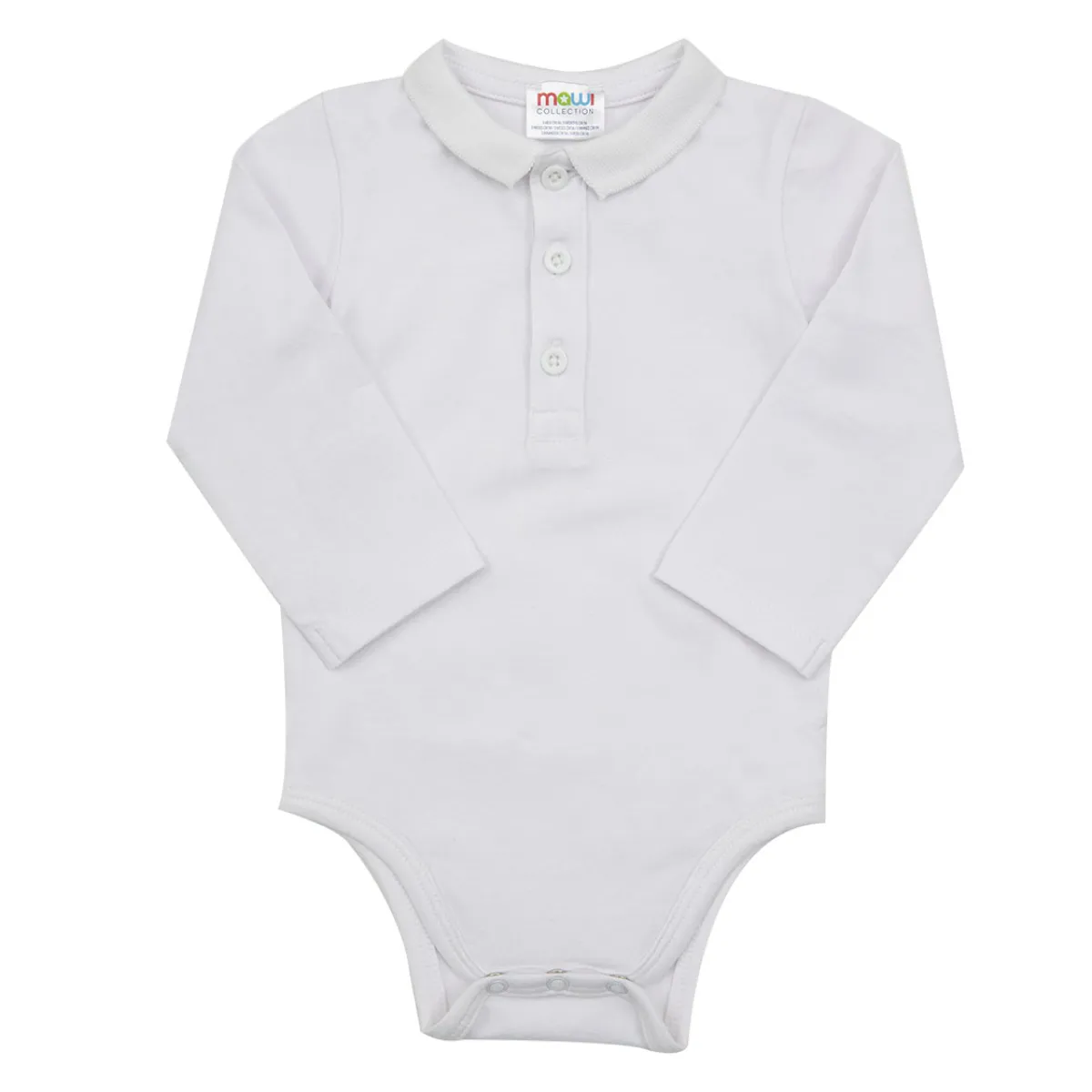Body jersey tinta unita bianco basico manica lunga con colletto. Oltre all’ apertura fessino frontale presenta una comoda apertura entrogamba con bottoncini a pressione per facilitare il cambio pannolino. Vestibilità comoda. Disponibili diversi colori