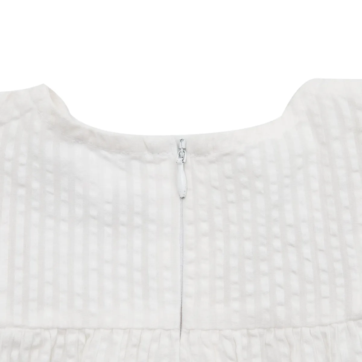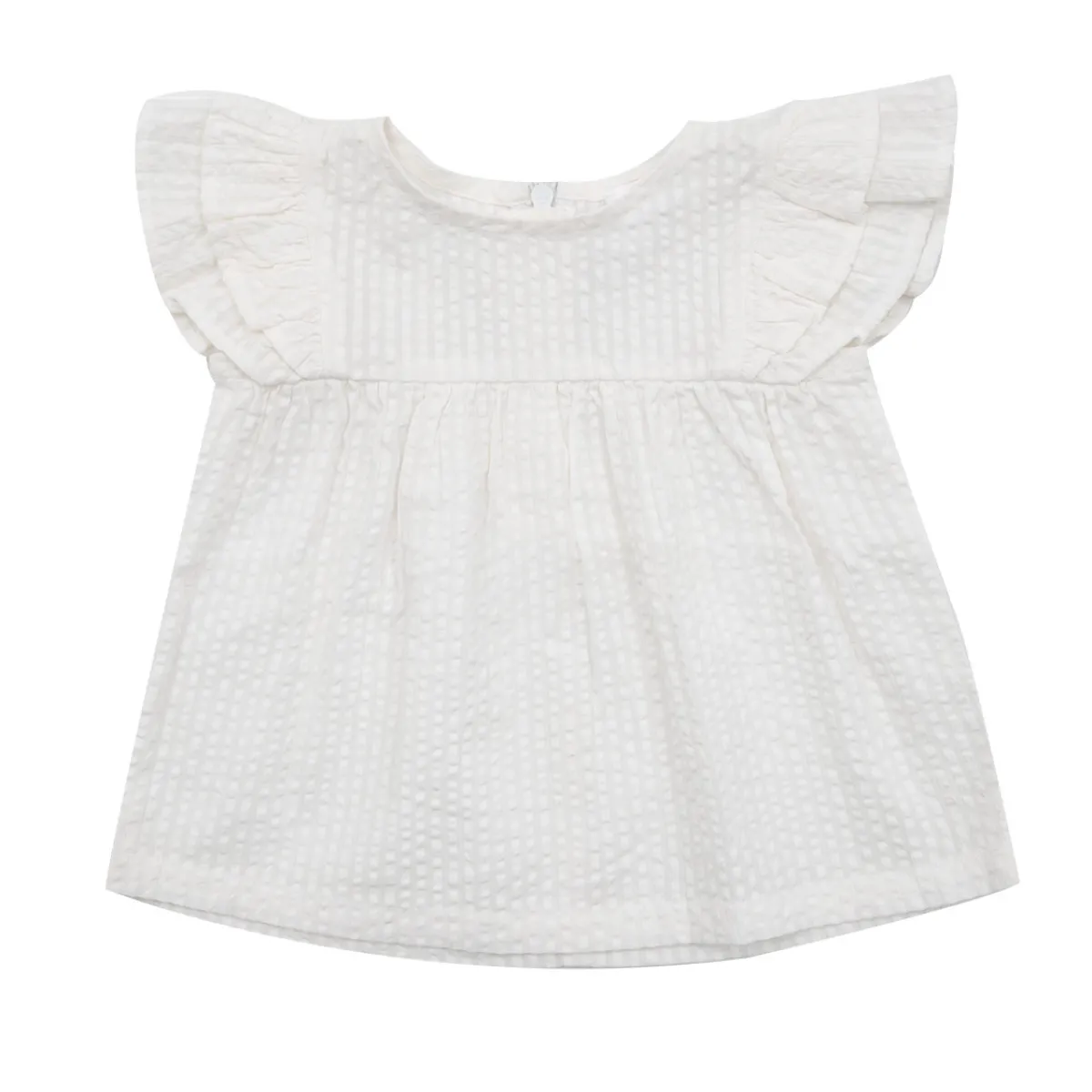 Tenera camicetta da bambina. Il capo si presenta in tinta unita bianco con trama semplice. Modello giromanica con frill. La vestibilità è morbida e pratica grazie alla presenza di cerniera sulla schiena. Il capo semplice è facilmente combinabile per varie occasioni. Accessori non in vendita. La confezione contiene solo il capo d’abbigliamento