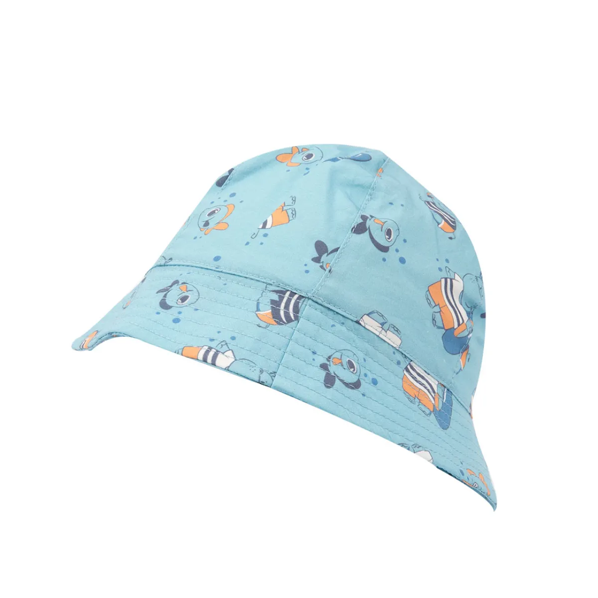 Cappellino alla pescatore da bambino. Il capo si presenta con base azzurra e stampa allover “pesci e ippo”, presente giro completo visiera morbida per offrire protezione dal sole.