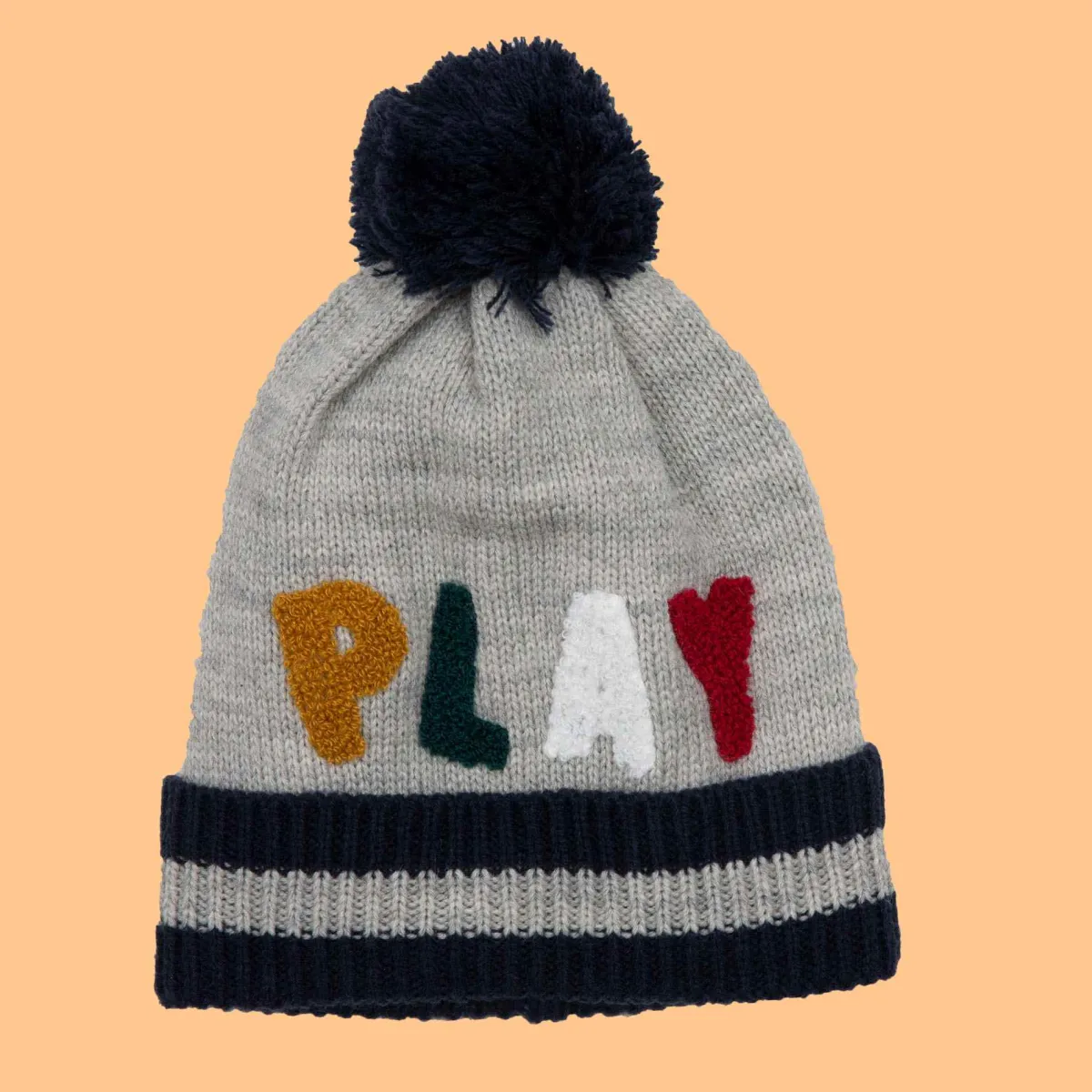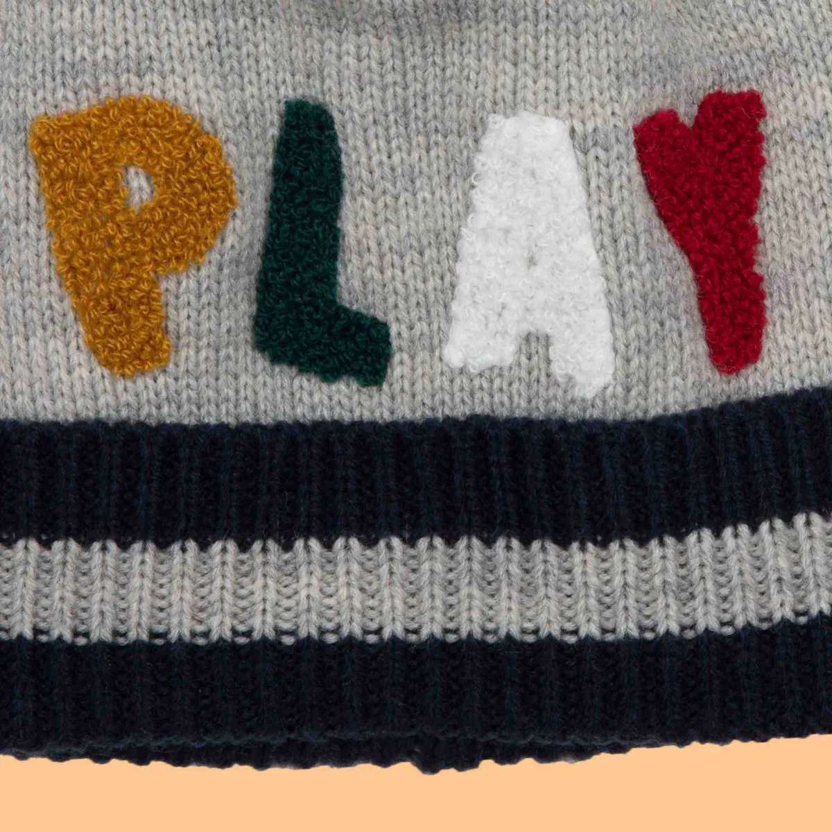 Modaiolo beretto jacquard tricot con pon pom applicato sul bordo superiore. Orlo a costina con risvolto. Motivo scritta play realizzato in applicazione spugna, perfetto stare al calduccio ed essere super cool.