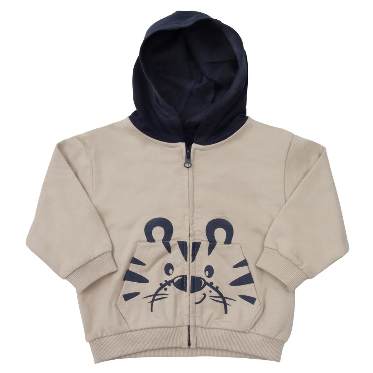 Cardigan in morbida felpa bicolore con stampa tigre, con cappuccio e tasca marsupio.