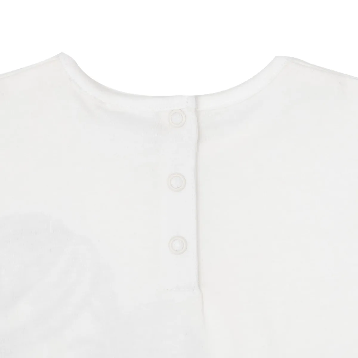 Casual t-shirt manica lunga jersey da bambina. Il capo si sviluppa in tinta unita bianco panna con stampa grande sul davanti . La vestibilità è morbida e pratica grazie ai bottoni a clip sulla schiena. Modello girocollo con maniche morbide. Accessori non in vendita. La confezione contiene solo il capo d’abbigliamento